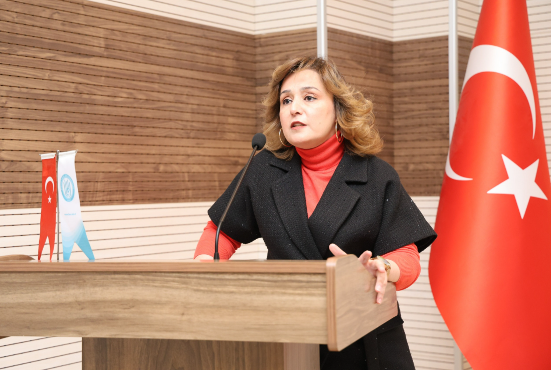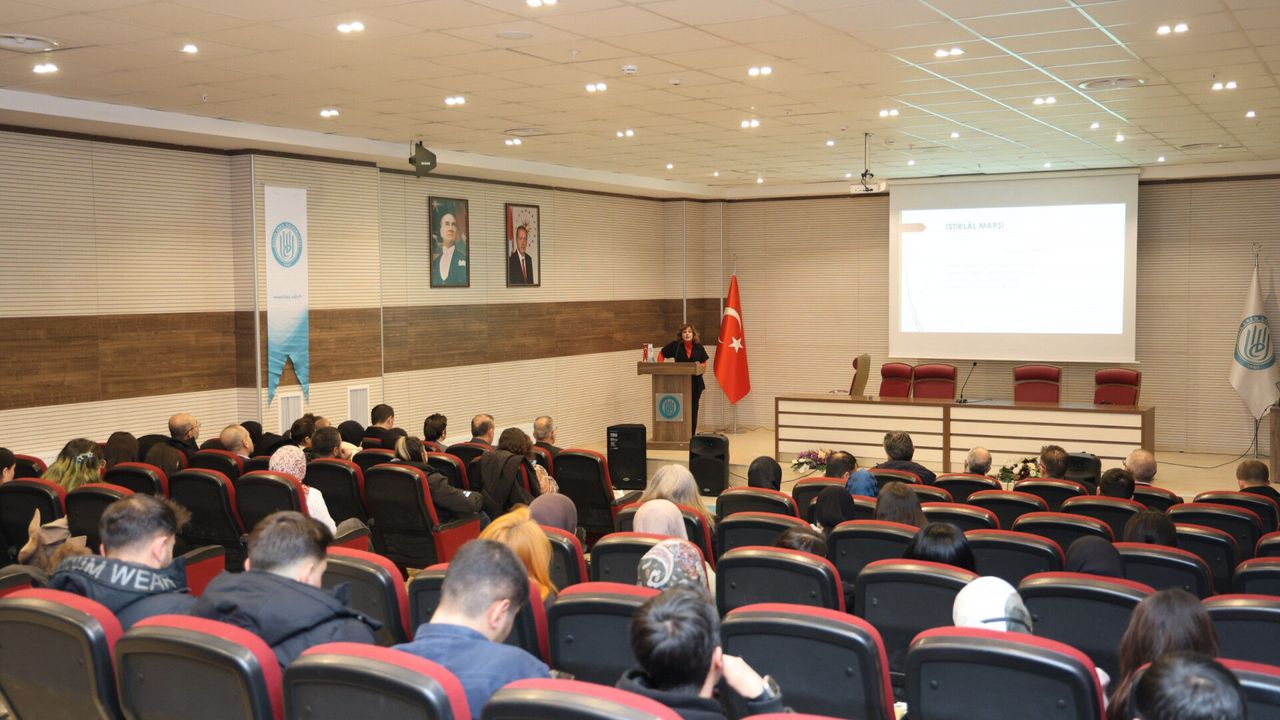Açılış konuşmasının ardından sunumunu yapmak üzere Fen-Edebiyat Fakültesi Öğretim Üyesi Doç. Dr. Esra Kürüm söz aldı. Doç. Dr. Kürüm, “İstiklâl Marşı’nı Kur’an Perspektifinden Okumak” başlıklı sunumunda, İstiklâl Marşı’nda yer alan kavramların Kur’an’daki temel değerlerle ilişkisini ele alarak marşın taşıdığı anlam katmanlarına dikkat çekti. Kürüm, İstiklâl Marşı’nın yalnızca bir bağımsızlık marşı olmanın ötesinde, milletin inanç dünyasını ve değerlerini yansıtan güçlü bir metin olduğunu vurguladı.