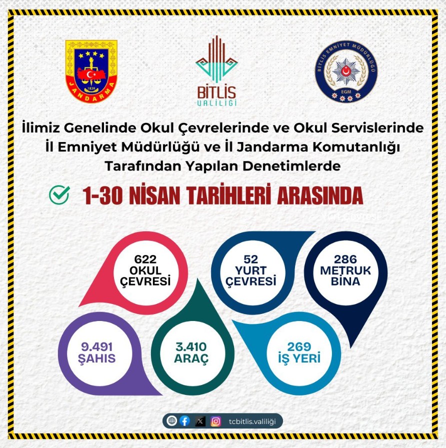Emniyet ve Jandarma ekiplerinin koordinasyonuyla 1-30 Nisan tarihleri arasında gerçekleştirilen uygulamalarda: 622 okul çevresi, 9.491 şahıs, 269 işyeri çevresi, 286 metruk bina, 3.410 araç ve 52 yurt çevresi denetlendi.