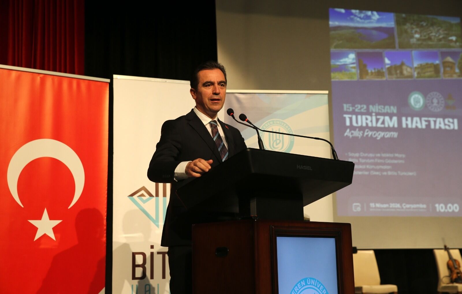 Bitlis’te 15-21 Nisan Turizm Haftası dolayısıyla düzenlenen program, Bitlis Eren Üniversitesi Merkezi Konferans Salonu’nda gerçekleştirildi. Saygı duruşu ve İstiklal Marşı’nın okunmasıyla başlayan etkinlikte, sinevizyon gösterimi yapıldı.