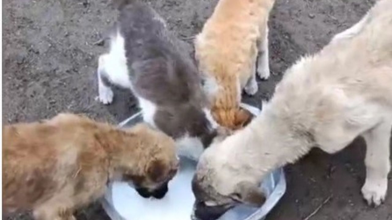 Sevimli hayvanların aynı kaptan süt içtiği anlar görenleri hem şaşırttı hem de gülümsetti. O anlara tanıklık eden Yener Özdemir, durumu cep telefonu kamerasıyla kaydetti. Özdemir’in daha sonra sosyal medyada paylaştığı görüntüler, bir anda viral oldu.