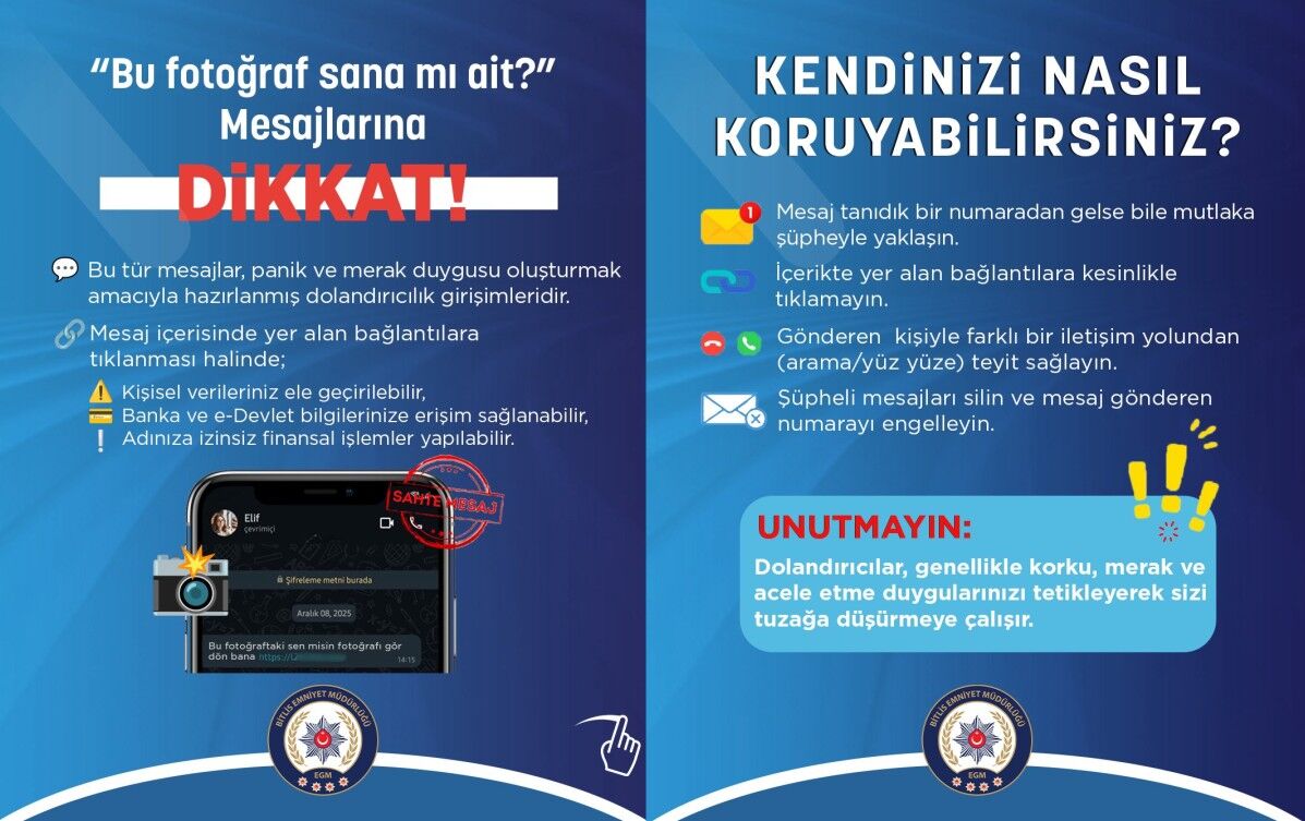 Emniyet yetkilileri, dolandırıcıların genellikle korku, merak ve acele etme duygularını tetikleyerek vatandaşları tuzağa düşürmeye çalıştığını hatırlatarak, bu tür mesajlara karşı dikkatli ve bilinçli olunması çağrısında bulundu.