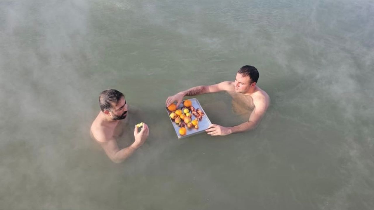 Hava sıcaklığının eksi dereceleri gördüğü günlerde kaplıcaya giren Mehmet Okay ve arkadaşları, sıcak suyun keyfini çıkararak kaplıca içerisinde meyve yedi. Soğuk havaya rağmen kaplıcanın şifalı sularında vakit geçiren grup, hem ısındı hem de farklı bir deneyim yaşadı.