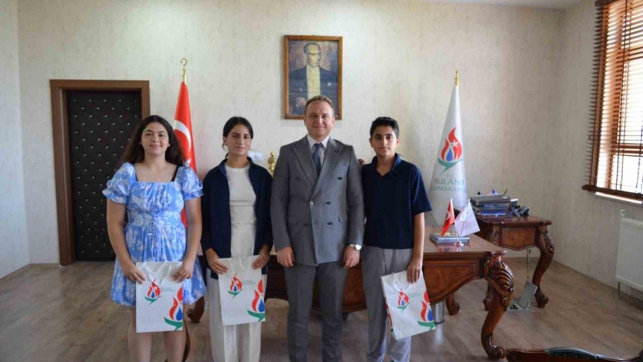Muş’un Bulanık ilçesinde Liselere Geçiş Sistemi (LGS) sınavında ilk 3’e giren öğrenciler, Kaymakam Ömer Övünç Koşansu’yu makamında ziyaret etti.