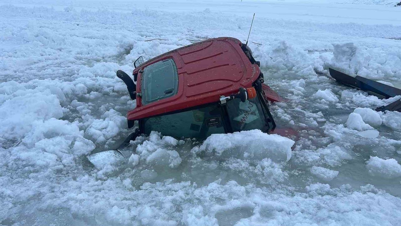 Ardahan'ın Çıldır ilçesindeki yüzeyi buz tutan Çıldır Gölü üzerinde kar temizleme çalışması yapan traktör, buzun kırılması sonucu suya gömüldü, sürücü son anda kurtarıldı.