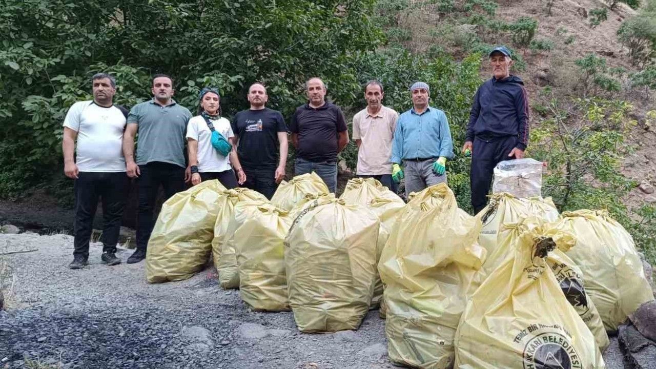 Hakkari’de bir araya gelen gönüllüler, Ava Ore Şelalesi ve çevresinde yaptıkları 4 saatlik çalışma sonucunda 33 çuval çöp topladı.