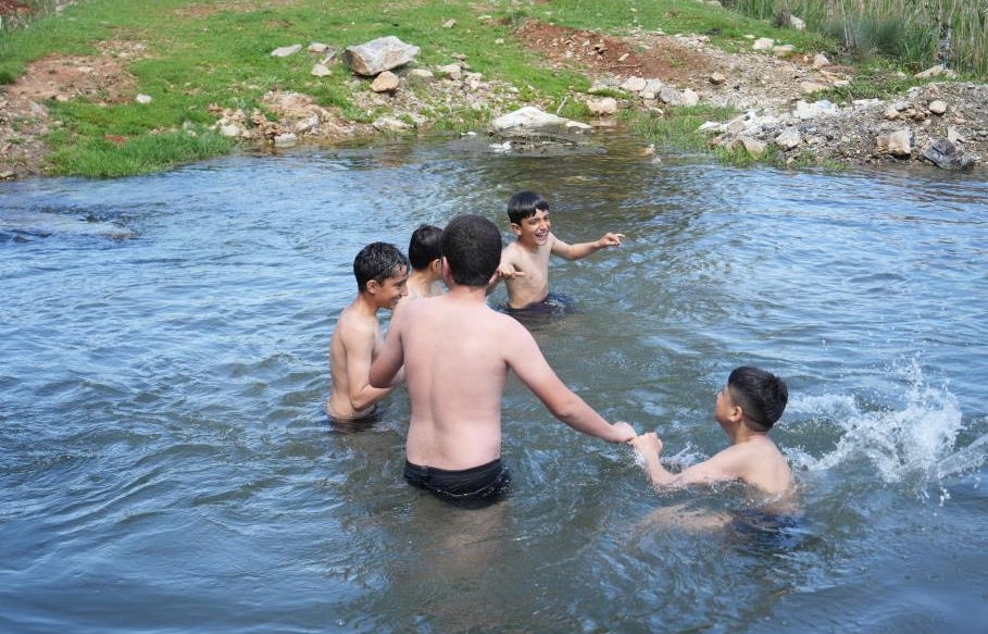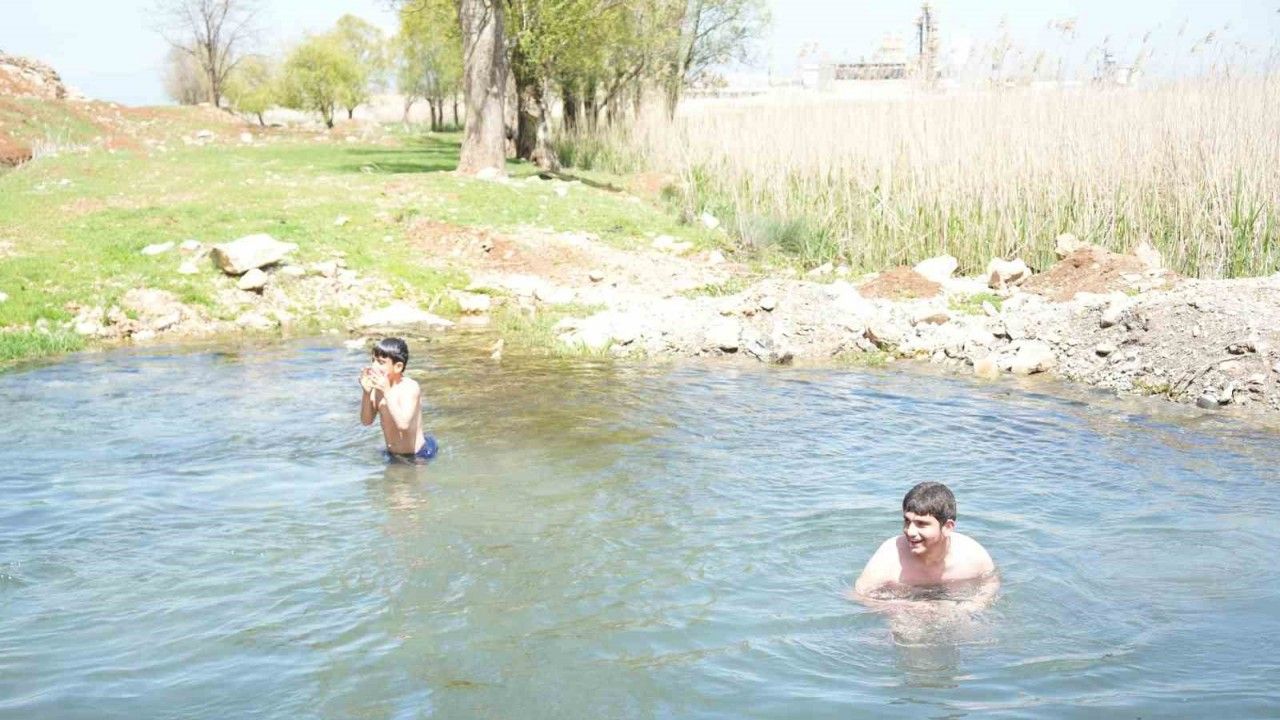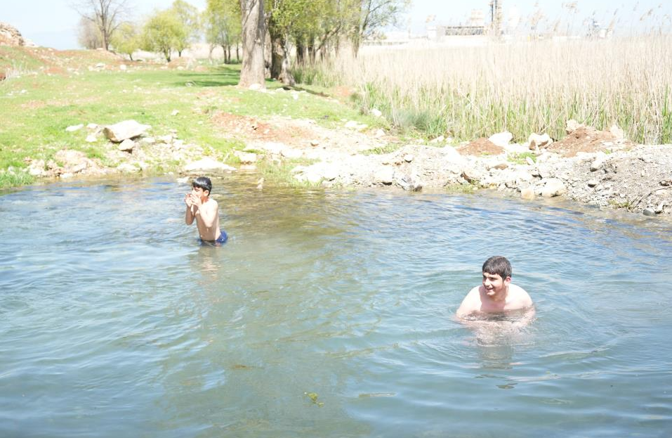 Kaynak suyunun aktığı bölgede doğal olarak oluşan gölette yüzen çocuklardan Yusuf Emre Kurtoğlu, "Su soğuk ama biz yüzmeyi seviyoruz. Soğuk sıcak dinlemiyoruz, her zaman burada yüzüyoruz. Biz yüzmeyi seviyoruz" şeklinde konuştu.