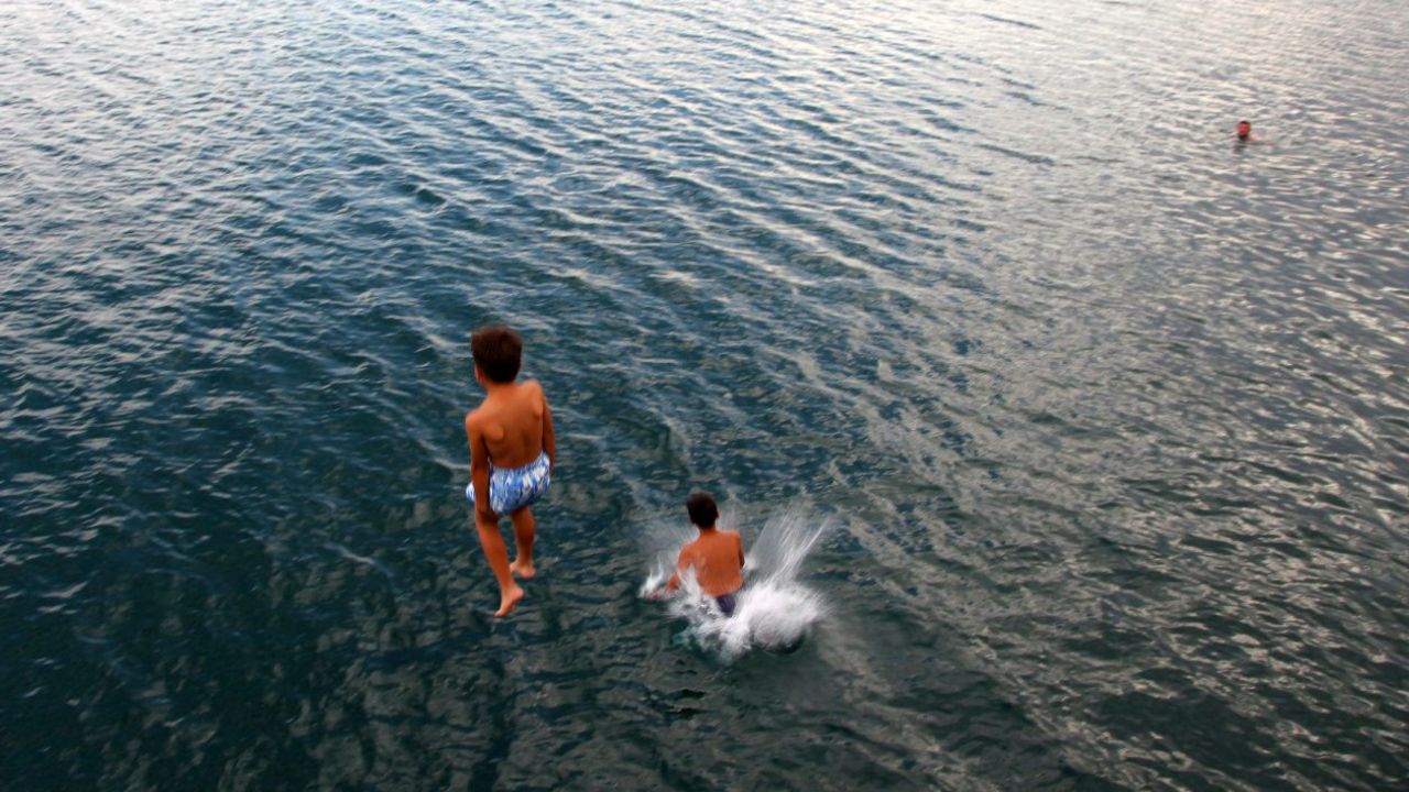 Bitlis’in Ahlat ilçesinde sıcaklığın 30 dereceyi aştığı öğle saatlerinde çocuklar, Van Gölü’nün serinliğiyle buluşuyor. Yükseklikten suya atlayan çocuklar, hem eğleniyor hem de kavurucu sıcaklara karşı gölün serinliğine sığınıyor.