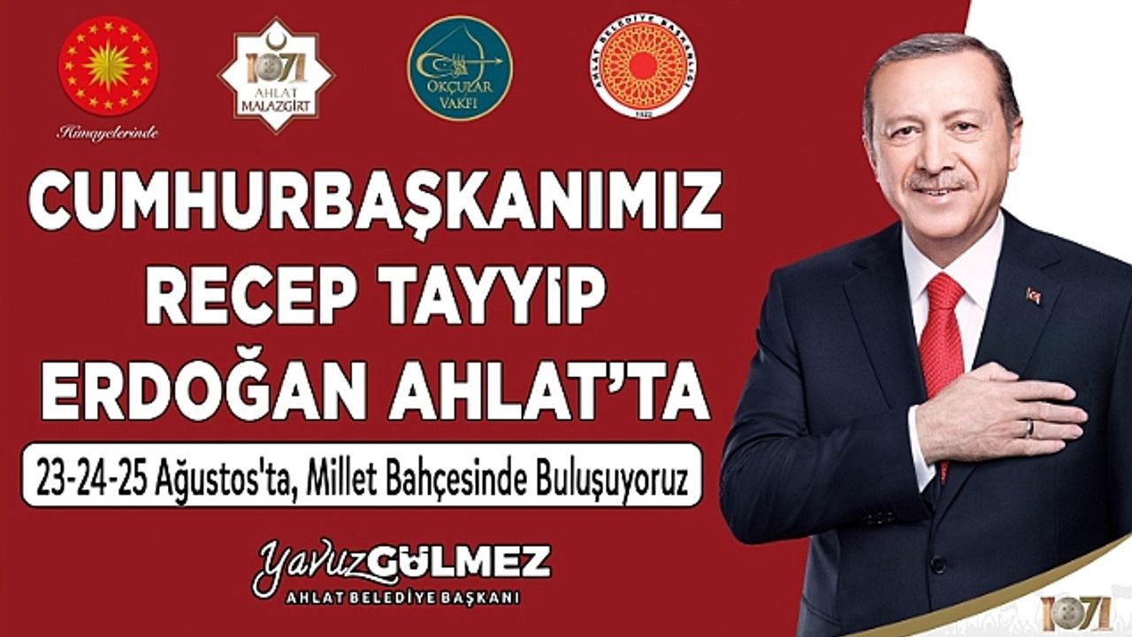 Cumhurbaşkanı Recep Tayyip Erdoğan, Malazgirt Zaferi'nin 953'üncü yılı kutlamaları, için bugün Bitlis'in Ahlat ilçesinde düzenlenen etkinliklerle katılacak. Erdoğan bugün öğlen saatlerinde Bitlis il merkezine geçerek burada Kiler İplik Fabrikası, kamu ve özel sektör yatırımlarının toplu açılış törenlerine katılacak. Daha sonra Ahlat’a geçecek olan Erdoğan burada ilk olarak Selçuklu Meydan Mezarlığını ziyaret edecek ve akabinde İlçenin Çarho mevkiinde bulunan Recep Tayyip Erdoğan Millet Bahçesi'nde kurulan 1071 Sultan Alparslan Otağındaki alanda halka seslenecek. Cumhurbaşkanı Erdoğan daha sonra Ahlat Cumhurbaşkanlığı külliyesine geçerek burada kabineyi toplayacak. Geceyi Ahlat’ta geçirecek olan Erdoğan ve devletin zirvesi 26 Ağustos’ta Muş’un Malazgirt ilçesine geçerek buradaki Malazgirt Zaferi'nin 953'üncü yılı kutlama programına katılacak. Cumhurbaşkanı Recep Tayyip Erdoğan’a MHP Lideri Devlet Bahçeli, Cumhur İttifakı ortakları partilerin genel başkanları veya temsilcileri, bakanlar, kuvvet komutanları da eşlik edecek.