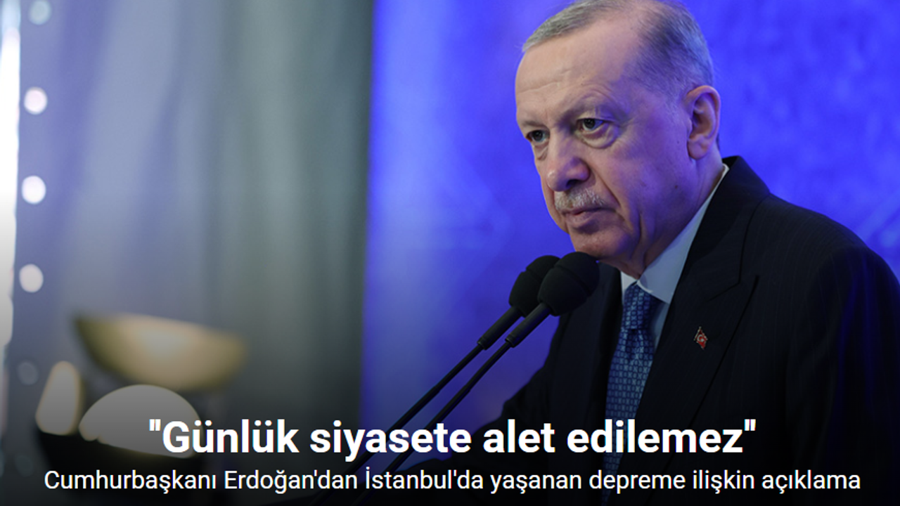 Cumhurbaşkanı Recep Tayyip Erdoğan, katıldığı programda İstanbul'da yaşanan 6.2'lik depreme yönelik açıklamalarda bulundu. Tüm vatandaşlara geçmiş olsun dileklerini ileten Erdoğan, "Dün bakanlarımızın bürokratlarımızı katılımı ile AFAD’da yaptığımız toplantıda en güncel bilgileri aldık, gerekli talimatları verdi. Can kaybımızın olmaması en büyük teselli kaynağımız. Devlet olarak tüm birikimimizle seferberlik anlayışı ile çalışıyoruz. Önümüzdeki kabine toplantımızda konuyu enine oyuna değerlendirecek, gerekli açıklamaları kamuoyuna yapacağız" ifadelerini kullandı.