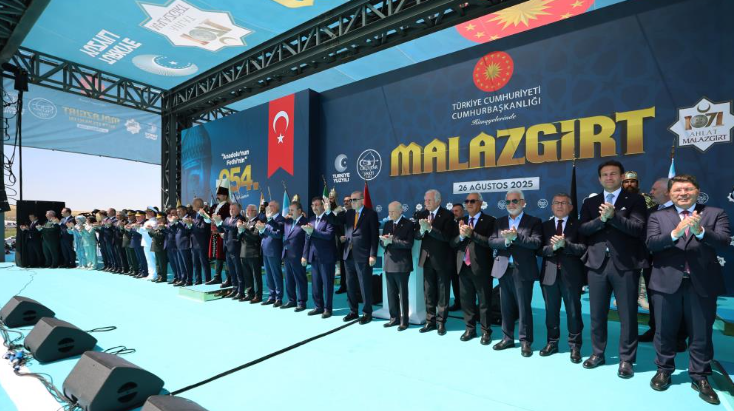Malazgirt Zaferi’nin 954. yıl dönümü kutlamalarına katılmak üzere dün geldiği Bitlis’in Ahlat ilçesinde geceyi geçiren Cumhurbaşkanı Erdoğan, beraberindeki MHP Lideri Devlet Bahçeli ve bakanlarla öğle saatlerine doğru Muş’un Malazgirt ilçesine geldi. Burada toplanan kalabalığa hitap eden Erdoğan, "Sevgili Muşlu kardeşlerim, ülkemin dört bir yanından şu anda Malazgirt’te bir araya gelen kardeşlerim, Milliyetçi Hareket Partisi’nin Genel Başkanı Sayın Devlet Bahçeli, siyasi partilerimizin saygıdeğer genel başkanları, yarınlarımızın teminatı sevgili gençler, kıymetli hanımefendiler, değerli misafirler, sizleri en kalbi duygularımla, hürmetle, muhabbetle selamlıyorum. Sizlerin şahsında Hakkari’den Edirne’ye, Muğla’dan Kars’a, Hatay’dan Sinop’a 81 ilimizdeki 86 milyon vatandaşımızın tamamına selamlarımı sevgilerimi gönderiyorum. Yine buradan İsrail’in barbar saldırıları altında hayat ve haysiyet mücadelesi veren Gazzeli, Filistinli kardeşlerimizi selamlıyor. Kendilerine dayanışma mesajlarımızı iletiyorum. Dün Ahlat’ta gençlerimizle hasret giderdik. Kubbetül İslam’ın o ferah ve vakur iklimini doya doya teneffüs ettik. Ardından kabine toplantımızı Cumhurbaşkanlığı Ahlat Külliyemizde gerçekleştirdik. Akabinde milletimize yine Ahlat’tan seslendik. Bugün de sizlerle birlikte o müstesna zaferin 954. yıl döneminde Malazgirt’teyiz. Bu meydanı hıncahınç doldurarak heyecanımıza ortak olan siz kıymetli kardeşlerime ayrı ayrı teşekkür ediyorum" dedi.