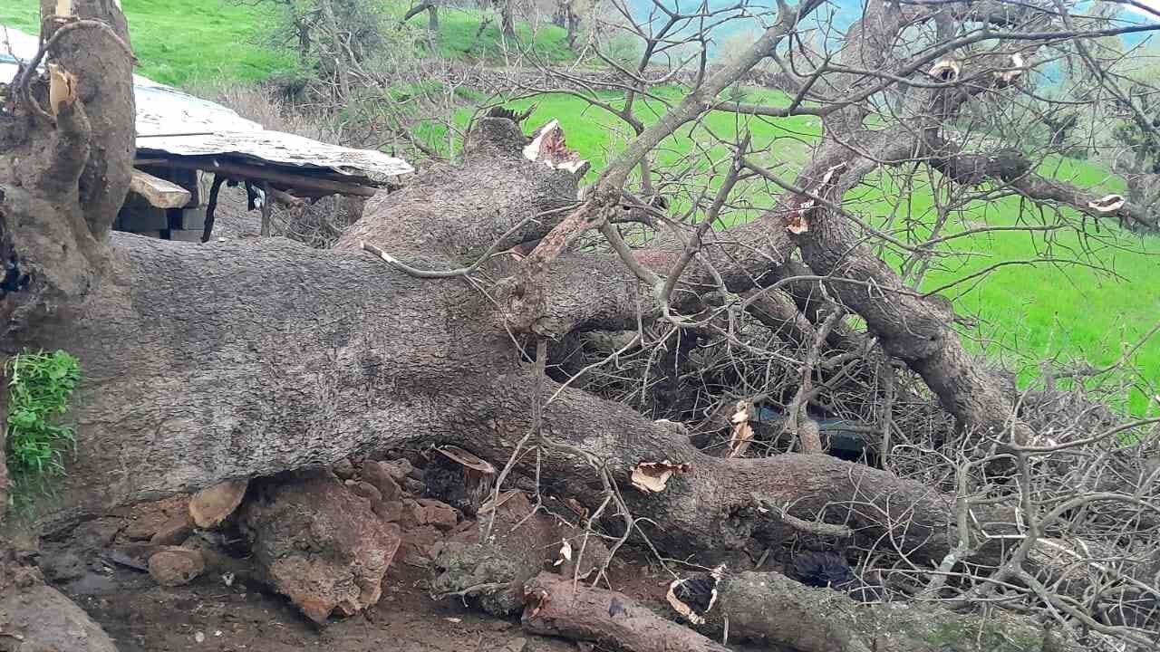 Yamaçtan kayan ağaç, İzzettin Ekinci'ye ait küçükbaş hayvan ağılının üzerine devrildi.
