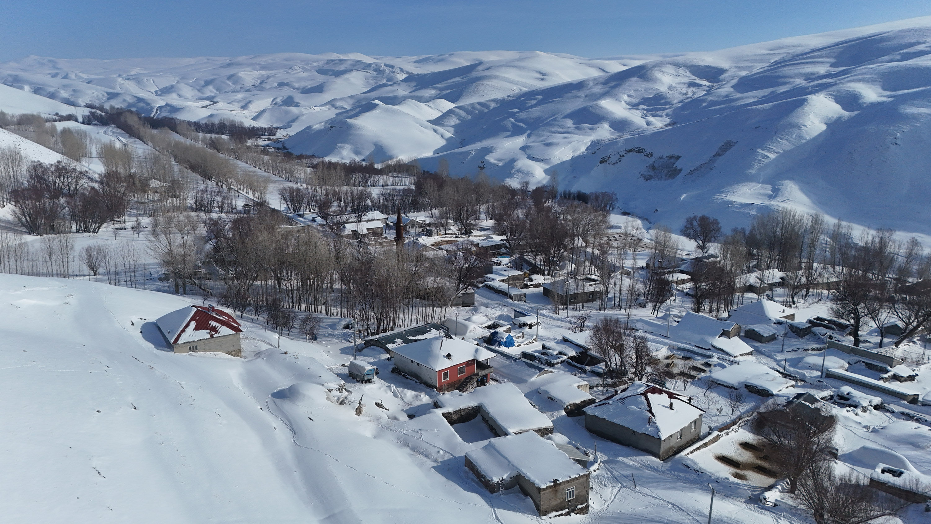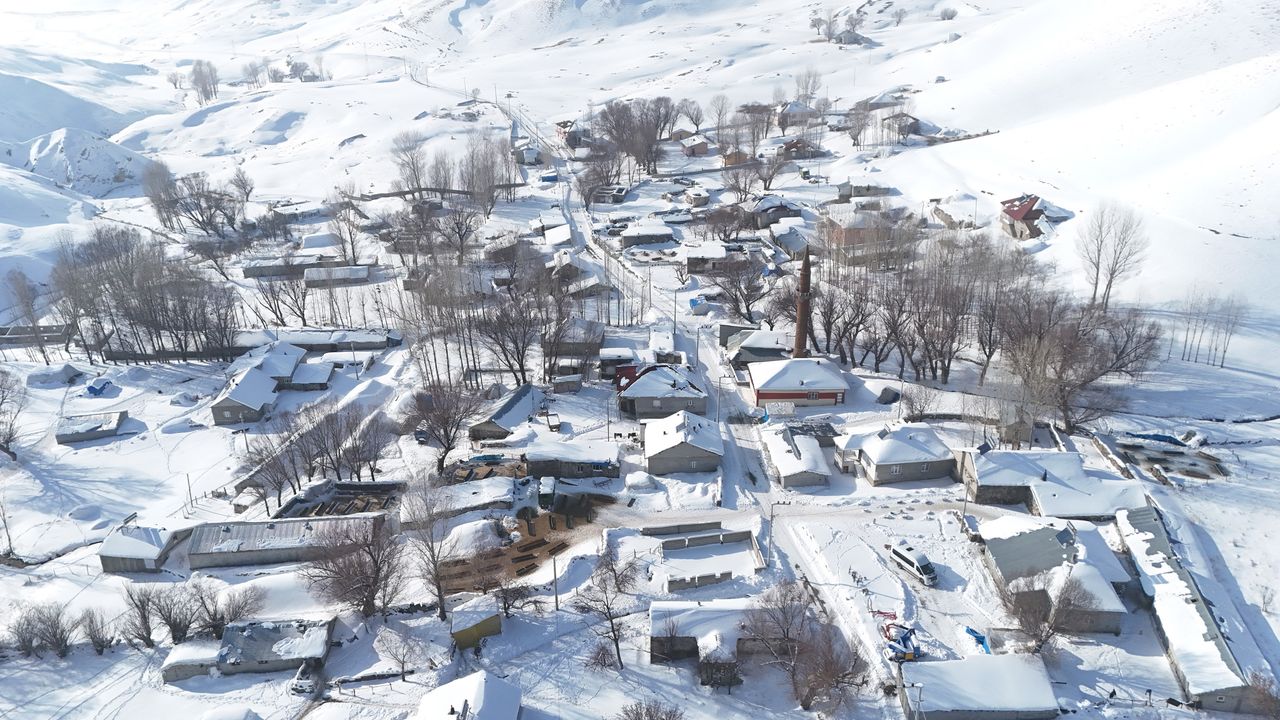 Havadan çekilen görüntülerde, kar örtüsü altında kalan tek katlı köy evleri dikkat çekti. Beyaz örtüyle çevrelenen evler, kış mevsiminin tüm güzelliğini yansıtırken, doğayla iç içe görüntüler seyir zevki yüksek kareler oluşturdu.