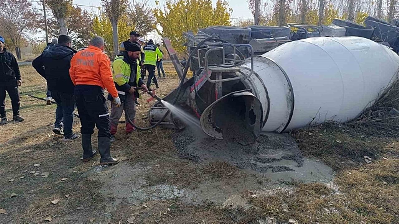 Iğdır'da inşaat için beton götüren beton mikseri bahçedeki çukurdan dolayı yan yattı, beton mikseri araç içindeki beton boşaltılarak kaldırıldı.