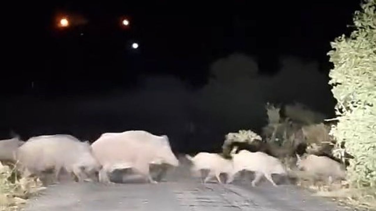 Elazığ Çevizdere köyünde domuzlar ve yavruları köy yoluna indi. Domuz ve yavruları, aracın gelişine aldırış etmezken, sürücü bir süre beklemek zorunda kaldı. Domuzlar bir süre sonra ormanlık alana giderek gözden kaybolurken sürücü ise yoluna devam etti. O anlar cep telefonu kamerasına yansıdı.