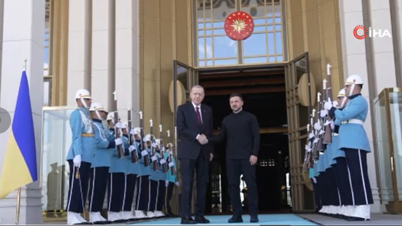 Cumhurbaşkanı Erdoğan, Zelenskiy'i Cumhurbaşkanlığı Külliyesi giriş kapısında karşıladı. Erdoğan ve Zelenskiy, merdivenlerde Türk ve Ukrayna bayrakları önünde fotoğraf çektirdi.