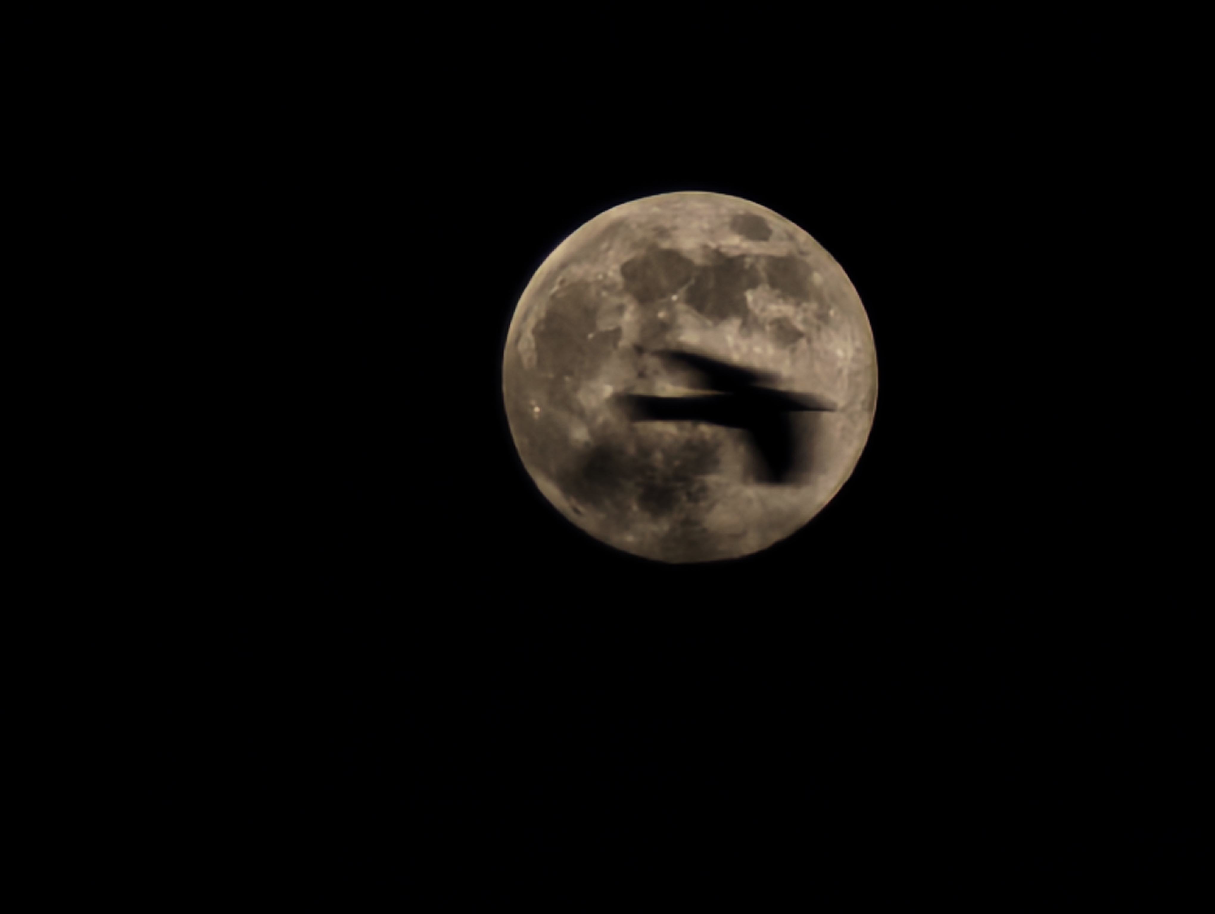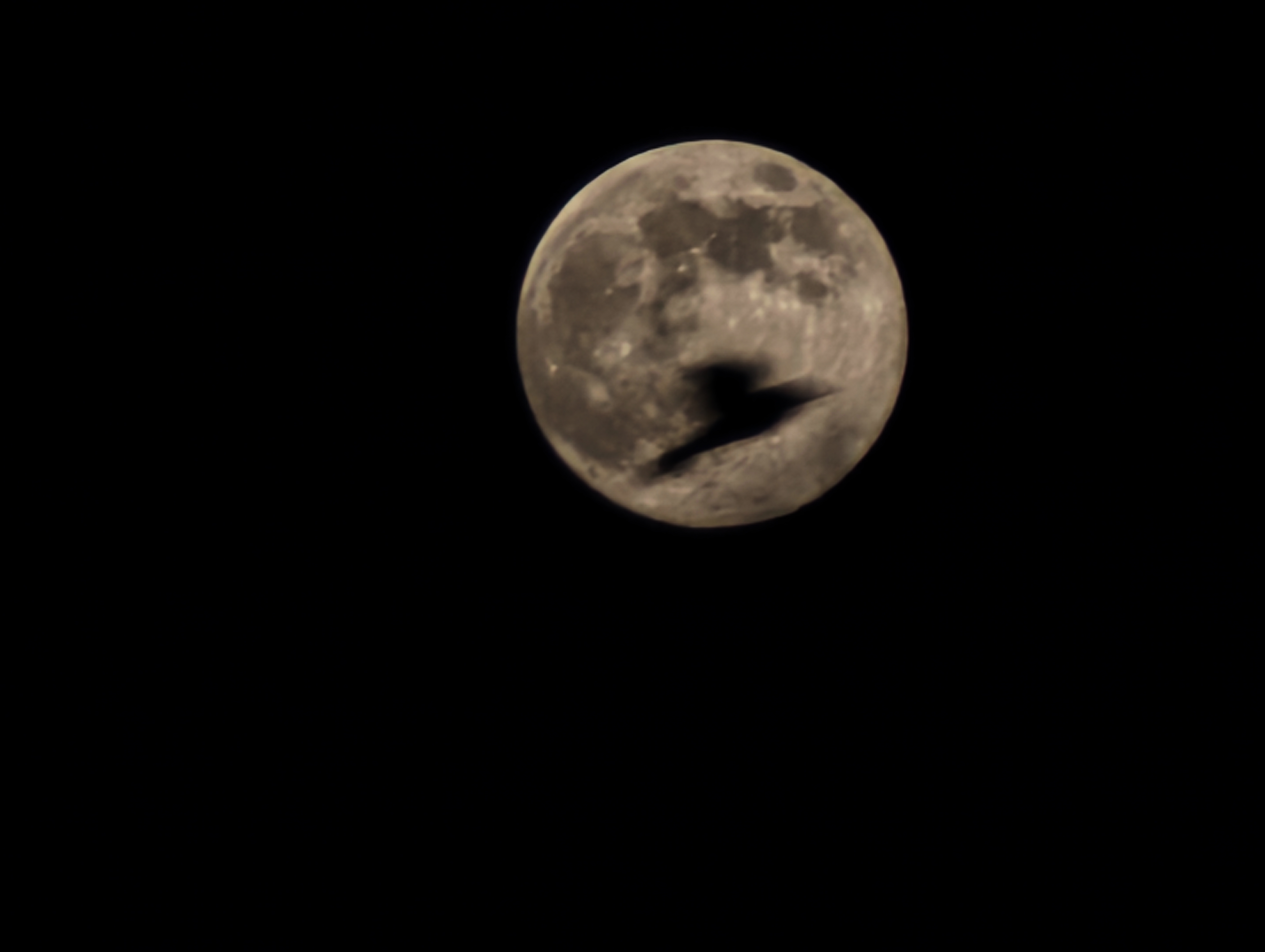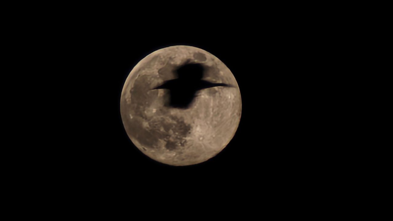 Oktay Subaşı'nın dolunay çekimi sırasında gökyüzünde uçan bir ekin kargası, tam ayın önünden geçerek etkileyici bir silüet oluşturdu.