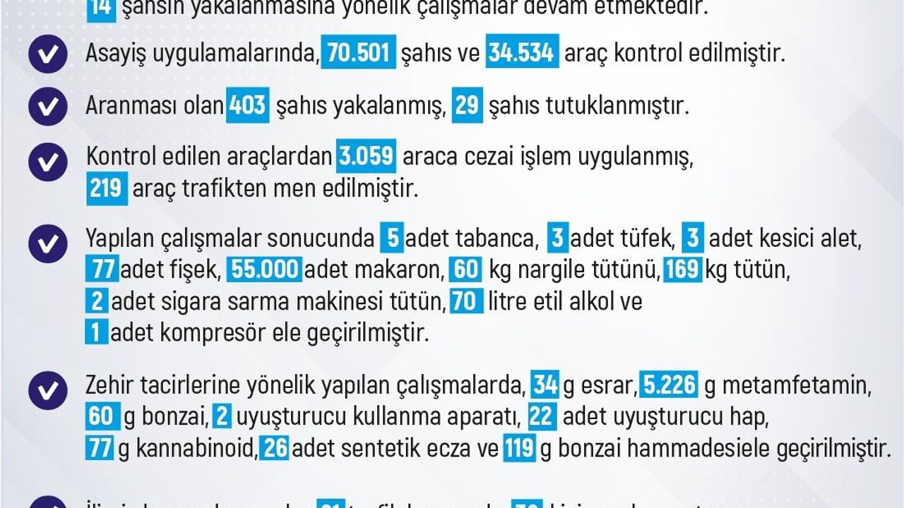 Zehir tacirlerine yönelik yapılan çalışmalarda, 34 gram esrar, 5.226 gram metamfetamin, 60 gram bonzai, 2 adet uyuşturucu kullanma aparatı, 22 adet uyuşturucu hap, 77 gram kannabinoid, 26 adet sentetik ecza, 119 gram bonzai hammaddesi ele geçirildi.