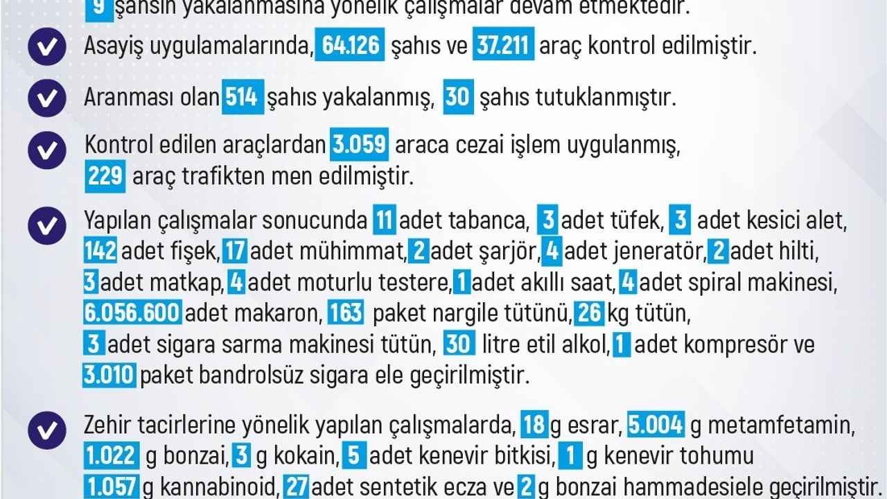 Yapılan çalışmalarda 11 adet tabanca, 3 adet tüfek, 3 adet kesici alet, 142 adet fişek, 17 adet mühimmat, 2 adet şarjör, 4 adet jeneratör, 2 adet hilti, 3 adet matkap, 4 adet moturlu testere, ladet akıllı saat, 4 adet spiral makinesi, 6 milyon 56 bin adet makaron, 163 paket nargile tütünü, 26 kilogram tütün, 3 adet sigara sarma makinesi tütün, 30 litre etil alkol, 1 adet kompresör ve 3 bin 10 paket bandrolsüz sigara ele geçirildi. Zehir tacirlerine yönelik yapılan çalışmalarda ise 18 gram esrar, 5 kilo 4 gram metamfetamin, 1.022 gram bonzai, 3 gram kokain, 5 adet kenevir bitkisi, 1 gram kenevir tohumu 1.057 gram kannabinoid, 27 adet sentetik ecza ve 2 gram bonzai hammaddesi ele geçirildiği bildirildi. Aynı zamanda kentte meydana gelen 35 trafik kazasında, 1 kişi hayatını kaybederken 38 kişi ise yaralandı.