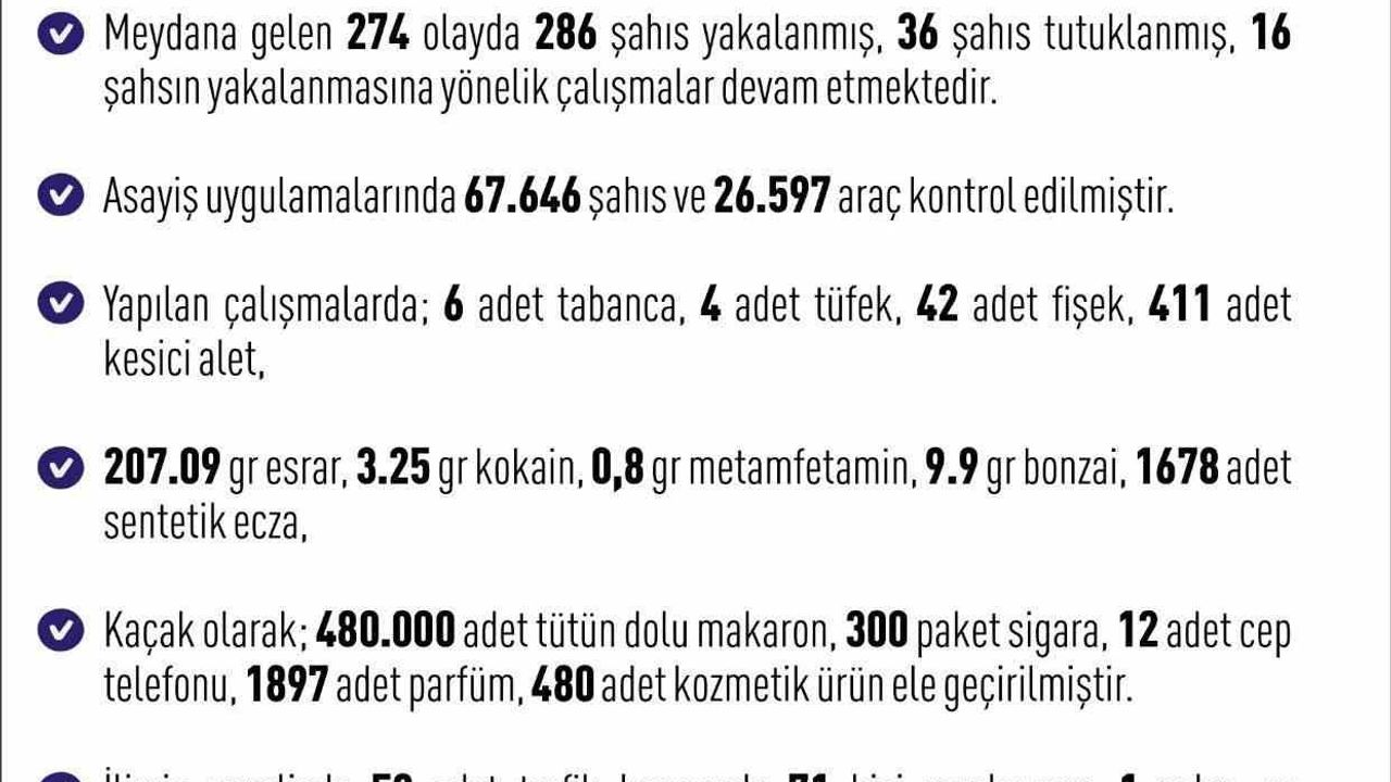 Elazığ Valiliği, 7-14 Temmuz 2025 tarihleri arasındaki asayiş raporunu paylaştı. Kent genelinde güvenlik güçlerinin müdahale ettiği 274 olayda toplam 286 kişi yakalandı. Yakalananlardan 36’sı tutuklanırken, 16 şüpheliyi yakalama çalışmaları sürüyor. Bir haftalık denetimlerde 67 bin 646 kişi ve 26 bin 597 araç kontrol edildi. Bu uygulamalarda 6 tabanca, 4 tüfek, 42 fişek ile 411 kesici alet ele geçirildi. Uyuşturucuyla mücadele kapsamında ise 207,09 gram esrar, 3,25 gram kokain, 0,8 gram metamfetamin, 9,9 gram bonzai ve bin 678 adet sentetik ecza bulundu. Kaçakçılıkla mücadelede de 480 bin dolu makaron, 300 paket sigara, 12 cep telefonu, bin 897 parfüm ve 480 kozmetik ürün ele geçirildi.