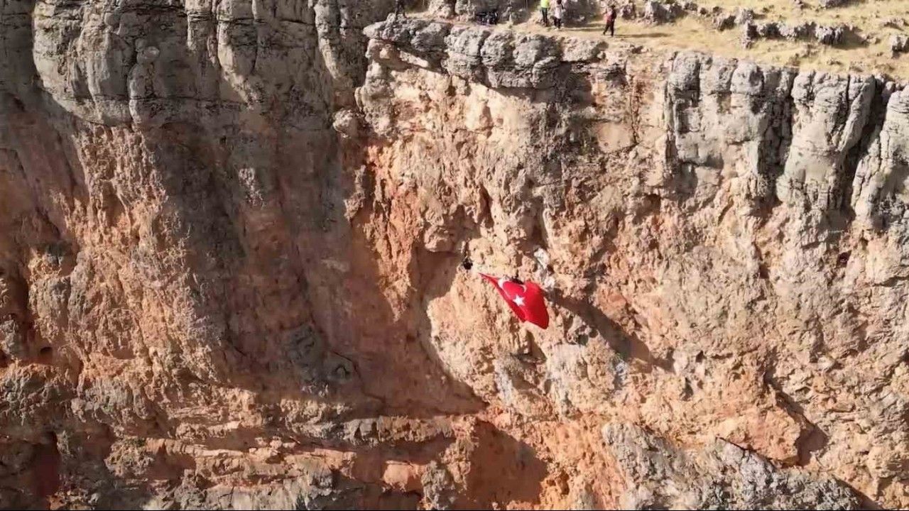 Elazığ’da 29 Ekim Cumhuriyet Bayramı kutlamaları sürüyor. Bu çerçevede Elazığ Doğa Sporları Spor Kulübü ve Ağın Kaymakamlığı ortak bir etkinlik düzenledi. Bu çerçevede 7 profesyonel dağcı Balkayası kayalıklarından halatlı iniş yaparak Türk Bayrağını dalgalandırdı. O anlar dron ile kaydedildi.