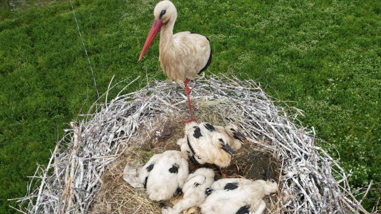Köy sakinlerinin ilgiyle takip ettiği leylek ailesi, bu yıl da baharın habercisi olarak bölgeye geldi. Anne leylek, yavrularını güneşten, yağmurdan ve tehlikelerden korumak için adeta nöbet tutuyor. Elektrik direğine yaptığı yuvada yaşamını sürdüren anne leylek, yumurtadan yeni çıkan yavrularının başından günlerce ayrılmadı.