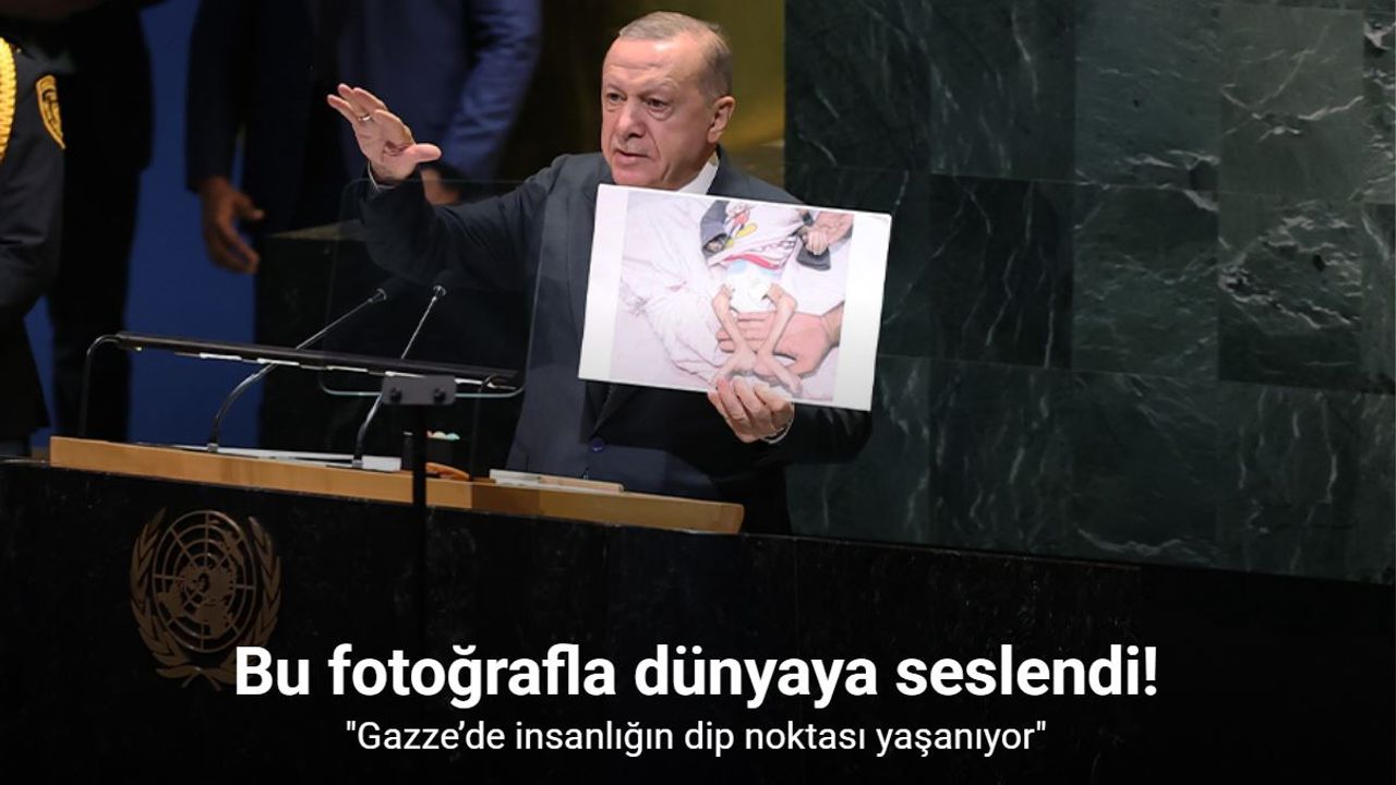 Cumhurbaşkanı Recep Tayyip Erdoğan, Birleşmiş Milletler (BM) Genel Kurulu'na hitabında, "Biz bugün, bu kürsüde kendi vatandaşlarımızla birlikte sesi kısılmak istenen Filistin halkının hissiyatına tercüman olmak için de bulunuyoruz" ifadelerini kullanarak, "Çocukların açlıktan, ilaçsızlıktan öldüğü bir dünyada huzur olur mu" dedi.