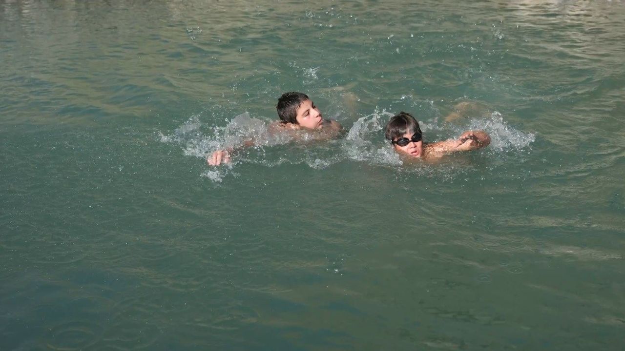 Kavurucu sıcakların etkili olduğu günlerde buz gibi suda serinleyen çocuklar, doğal havuzda yüzerek keyifli anlar yaşıyor.