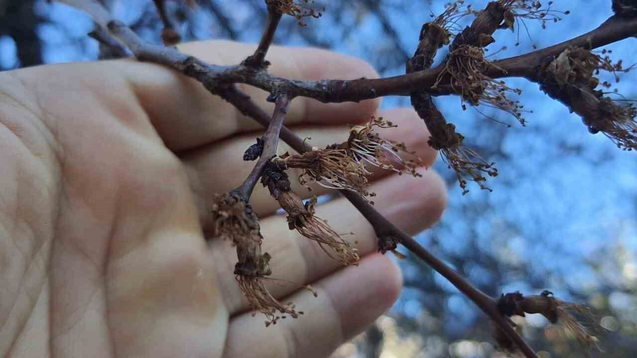 Zirai donun etkisiyle kayısı ağaçlarının beyaz çiçek yapraklarının uç kısımlarında kahverengiye dönüşüm gözlemlendi. Ağaç dallarındaki bu renk değişimi, don olayının etkisini ortaya koydu.