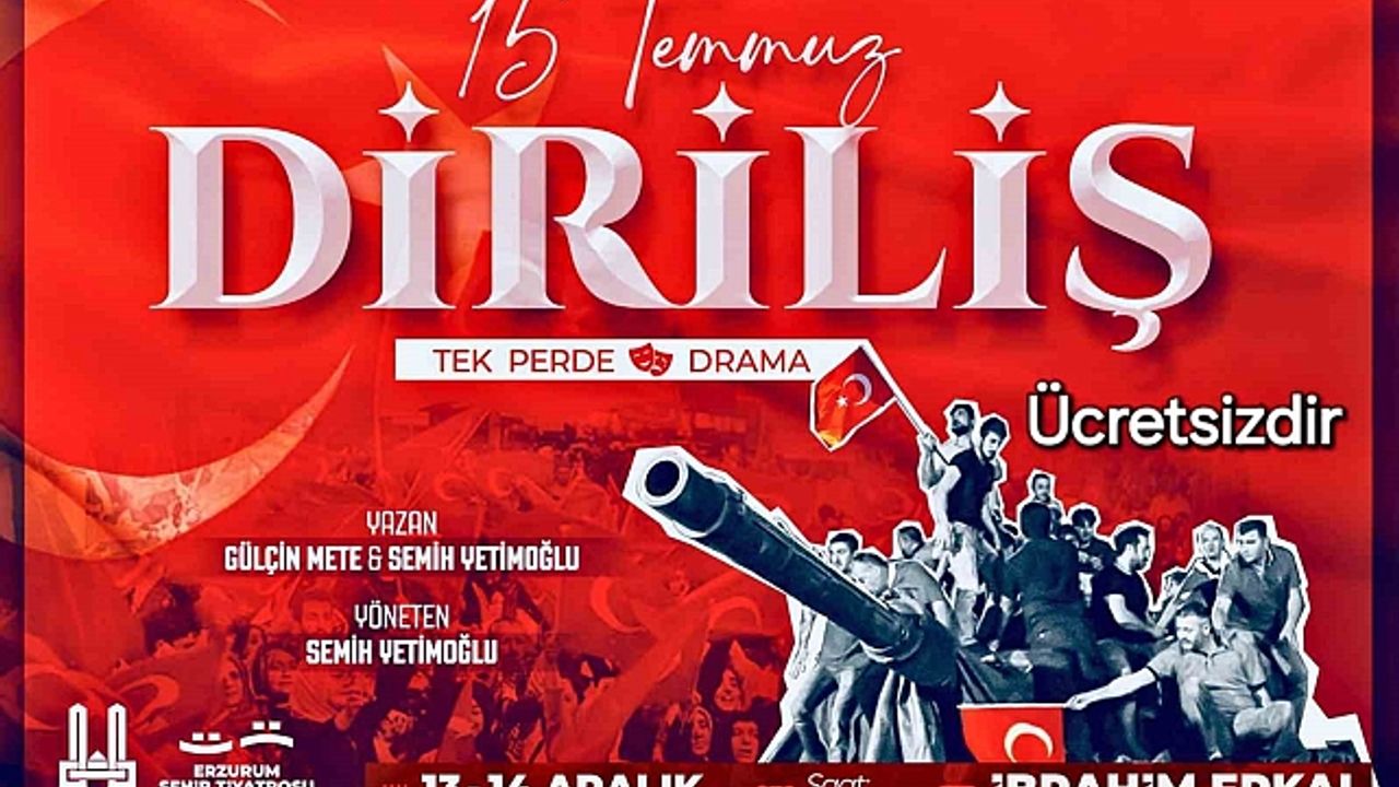 Erzurum Şehir Tiyatrosu Genel Sanat Yönetmeni Semih Yetimoğlu, Erzurum Büyükşehir Belediye Başkanı Mehmet Sekmen ve İl Kültür ve Turizm Müdür Ahmet Yer'in desteği ile hazırlanan oyuna tüm Erzurum halkı ve tiyatro severleri davet ettiklerini belirti. '15 Temmuz Diriliş' oyununda darbe girişiminde yaşanan olaylar konu ediliyor. Gerçek görüntülerin de kullanıldığı oyunun yazarı Gülçin Mete - Semih Yetimoğlu, yönetmenliğini Semih Yetimoğlu, sanat yönetmenliğini Ercan Seval, sahne amirliğini Ahmet Ayık yapıyor. Oyunda kostümde Fatma Bayar, müzikte Ceyda Seval ve dekorda Ekrem Budak görev aldı. '15 Temmuz Diriliş' oyunun kadrosu ise Semih Yetimoğlu, Ercan Seval, Ahmet Ayık, Ekrem Budak, Sıla Naz Daştan, Özge Samer, Serhat Karaoğlu ve Rahime Ünal'dan oluştu.