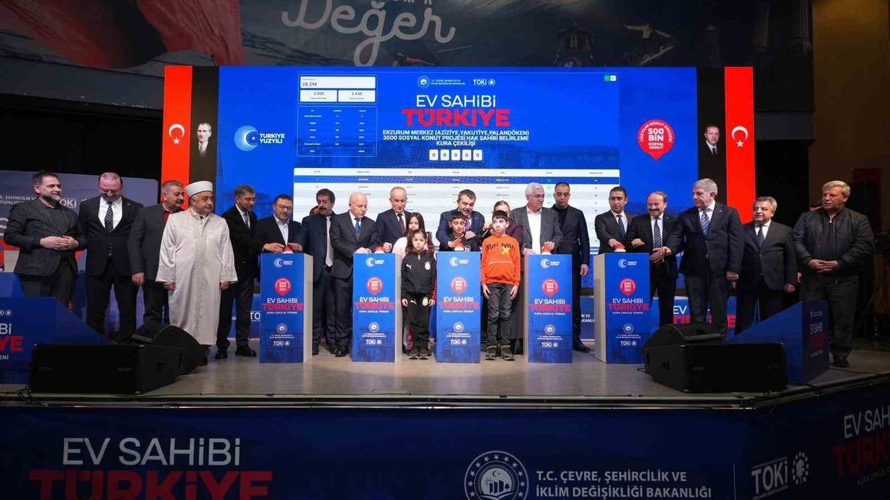 Yüzyılın Konut Projesi'nde kuralar devam ediyor. 500 bin Sosyal Konut Projesi kapsamında; Milli Eğitim Bakanı Yusuf Tekin, Bakan Yardımcısı Ömer Bulut ve TOKİ 5 No'lu Uygulama Dairesi Başkanı Cavit Güler'in katılımlarıyla Erzurum projeler için kura çekildi.