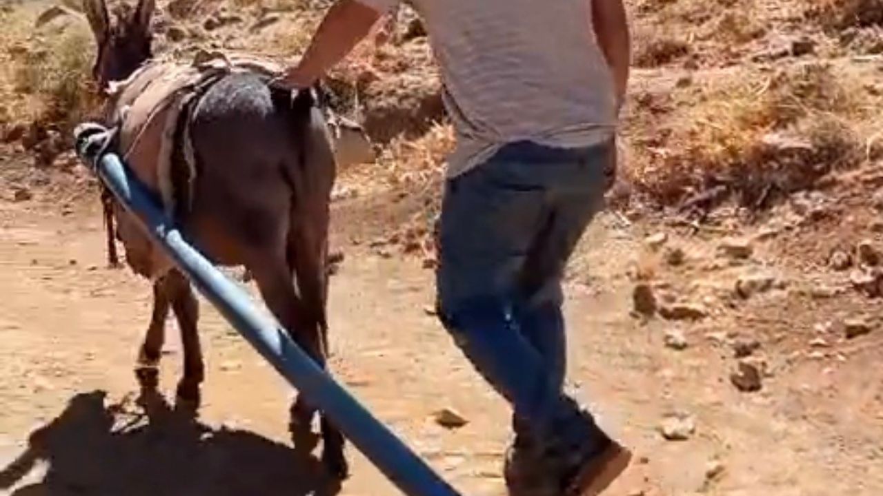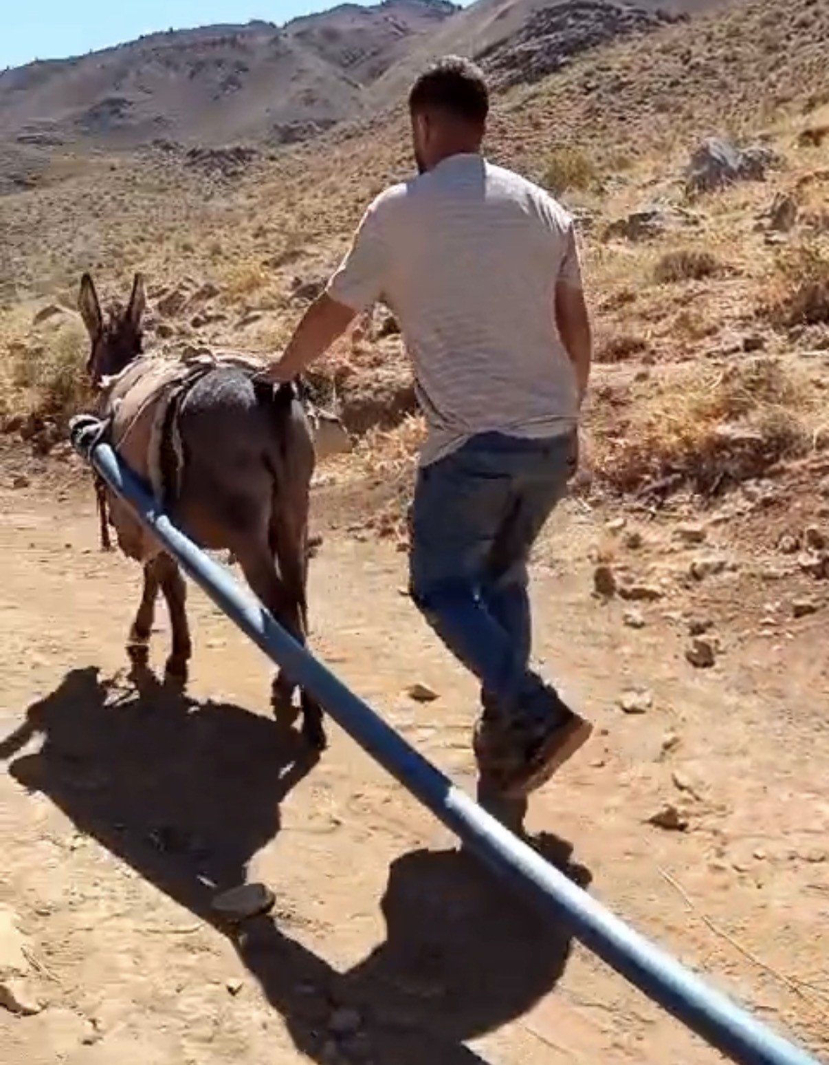 Bitlis’in Yolalan Belde Belediyesi tarafından yürütülen içme suyu hattı çalışmasında iş makinelerinin gidemediği bölgelerde malzemeler eşeklerle taşınıyor.