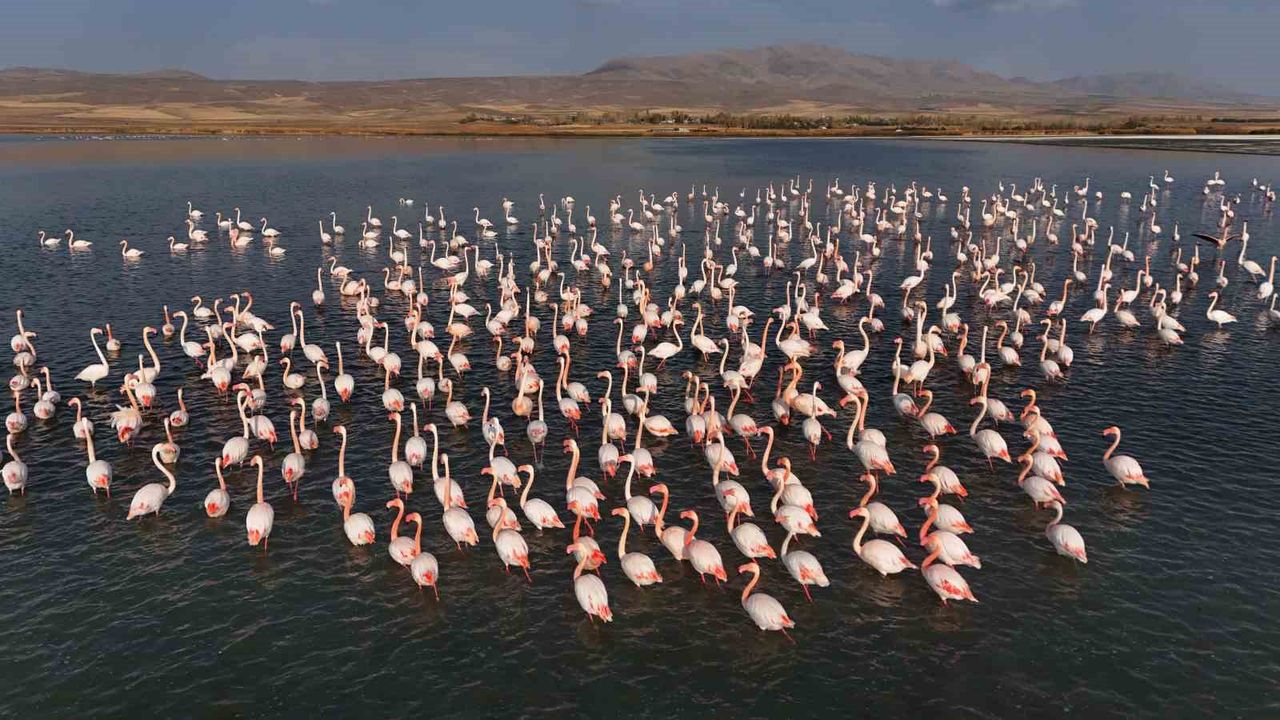 Göçmen kuşların Kuzey Afrika'dan İran'a uzanan yolculuğunda en önemli konaklama merkezlerinden Van Gölü havzası, sulak alanlarıyla çok sayıda türden binlerce kuşu bünyesinde barındırıyor. Van'ın doğusunda yer alan, eşsiz doğal güzelliği ve biyolojik çeşitliliğiyle dikkat çeken Erçek Gölü, her yıl olduğu gibi bu yıl da flamingoların göç yolculuğunda uğrak noktası oldu. Pembe tüyleri, uzun zarif boyunları ve estetik duruşlarıyla doğa tutkunlarının gözdesi olan flamingolar, hava sıcaklığının mevsim normallerinin üzerinde seyrettiği bölgede konaklama sürelerini uzattı. Başta İran'ın Urumiye Gölü olmak üzere birçok gölün kuruması sonrası Van Gölü kıyıları ve Erçek Gölü'nde konaklayan flamingolar bölge ekosistemine canlılık katmaya devam ediyor. Suya düşen nazlı gölgeleri ve sakin danslarıyla Erçek Gölü'nde görsel şölen oluşturan flamingolar havadan dronla görüntülendi.