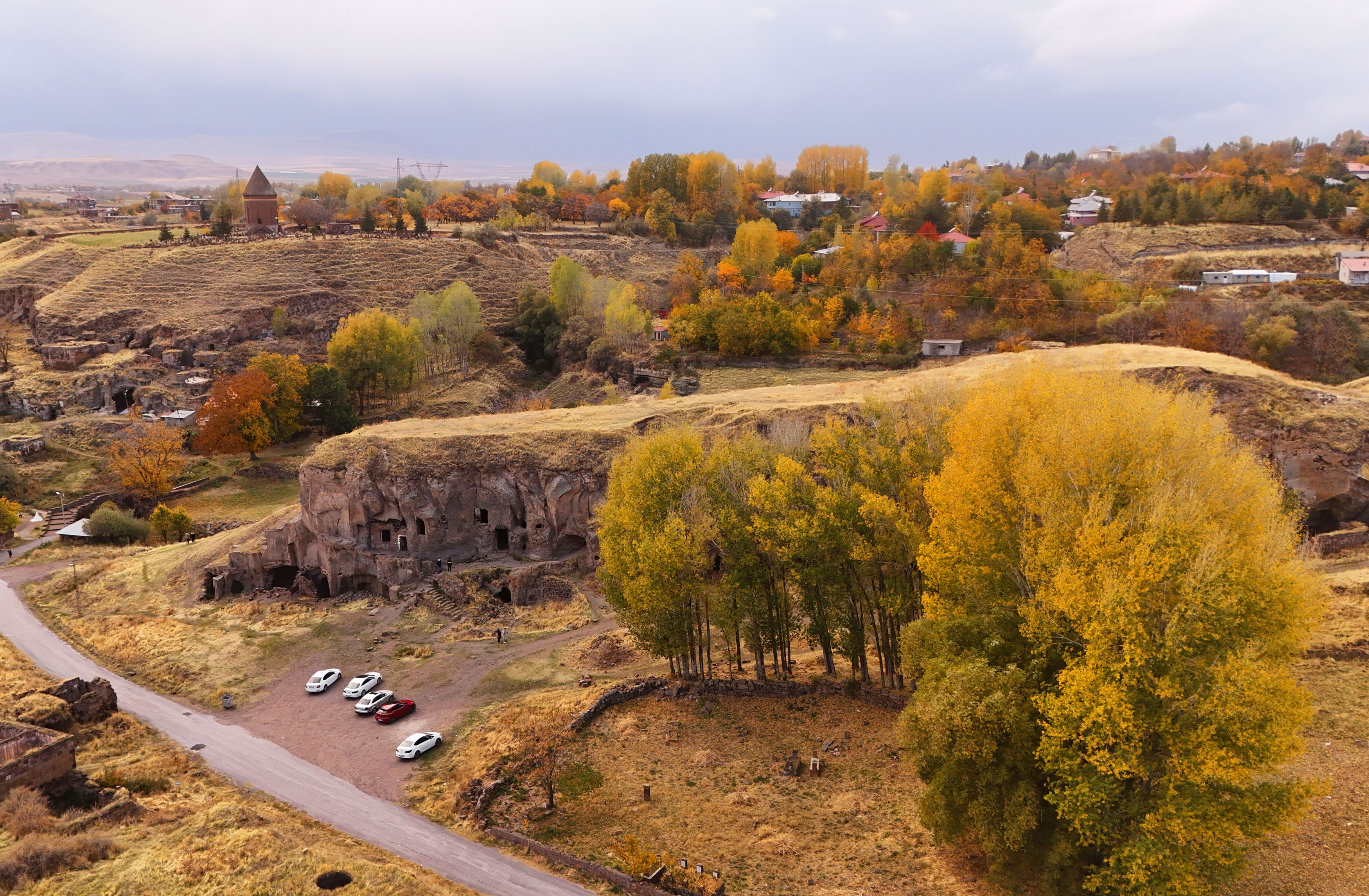 Tarihi yapıların çevresinde bulunan ağaçların sararmasıyla ortaya çıkan manzara, drone ile görüntülendi.