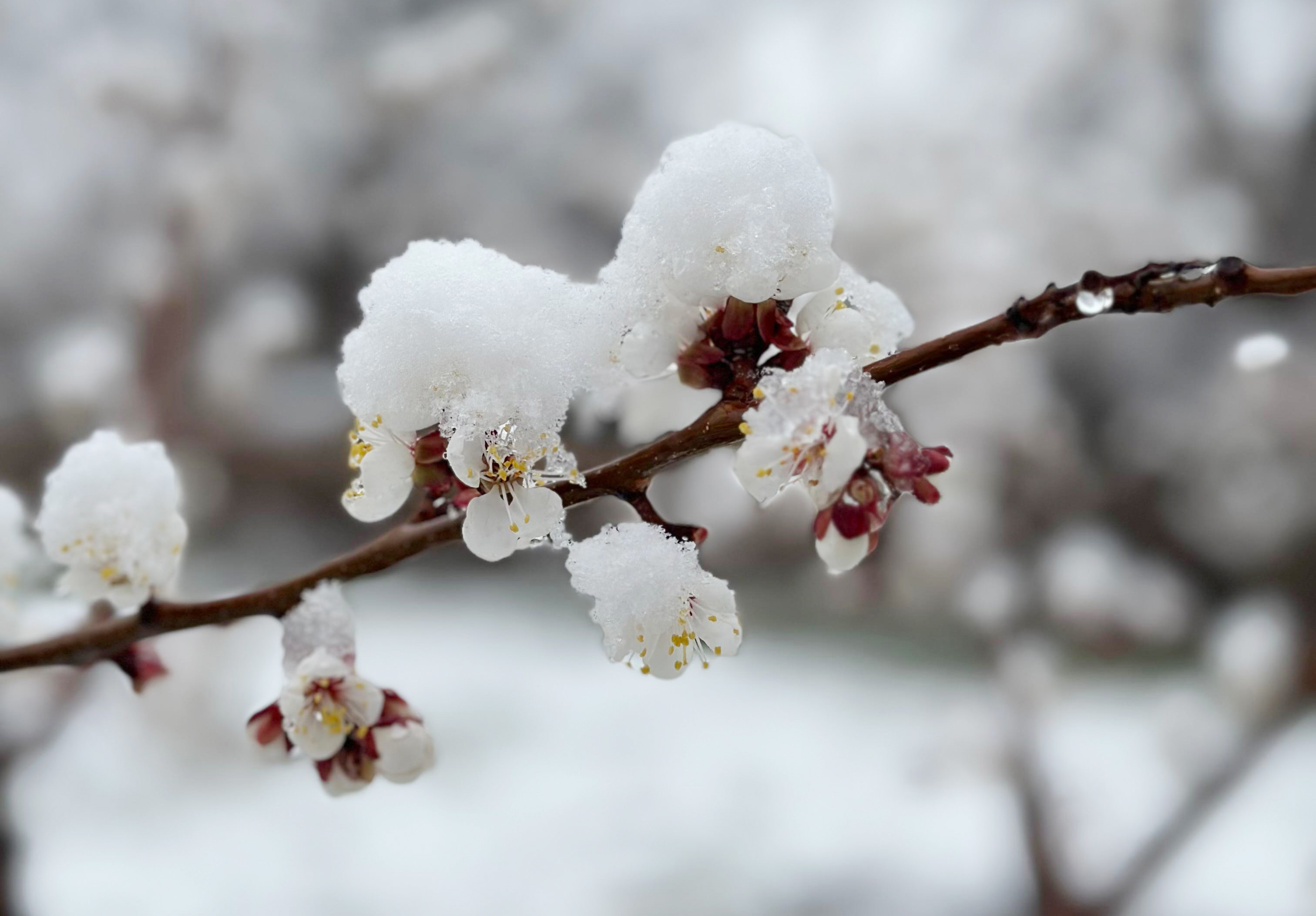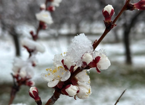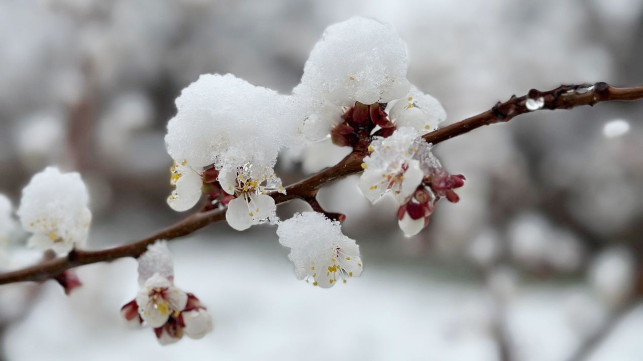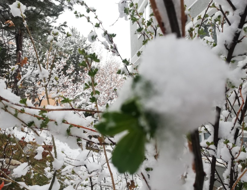 Nisan ayının tipik görüntüsü olan açmış çiçekler, beklenmedik karla birlikte tezat ve etkileyici bir görüntü oluşturdu.