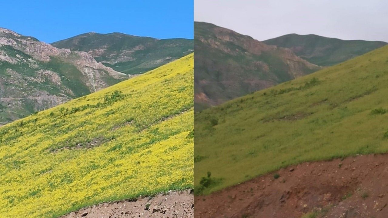 Hakkari’nin Otluca köyünde hidroelektrik santrali civarındaki tepelik alanda gözlemlenen ilginç bir doğa olayı görenleri hayran bırakıyor. Güneşli havalarda açan sarı çiçekler, gün batımına doğru adeta birer birer kayboluyor. Toprağın rengi ve taşların renklerinin de değiştiği fotoğraf karesinde açıkça ortaya çıkıyor. Değişmeyen tek şey ise yem yeşil bitki örtüsü.