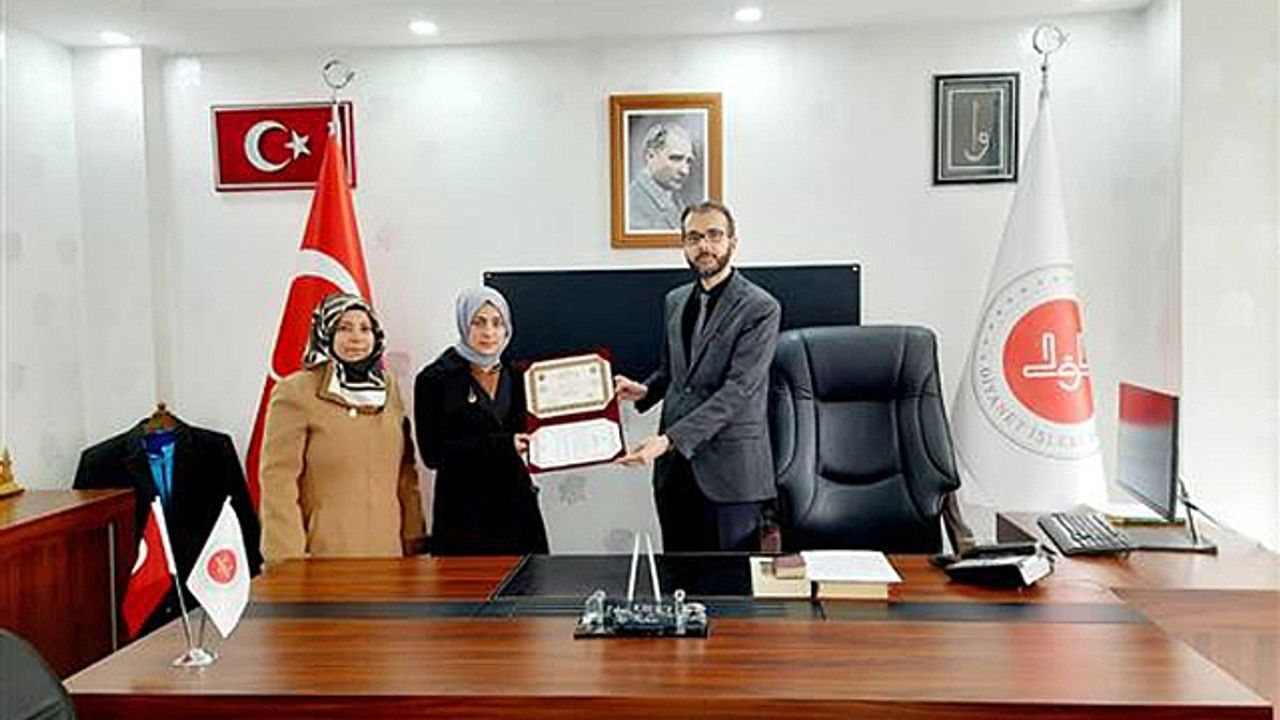 Adilcevaz Hatuniye Yatılı Hafızlık Kız Kur'ân Kursu’nda hafızlığını tamamlayan, yapılan sınavda başarılı olan Rabia Dilman'a Diyanet İşleri Başkanlığı tarafından gönderilen hafızlık belgesi Adilcevaz Müftüsü Erkan Karaca tarafından takdim edildi.