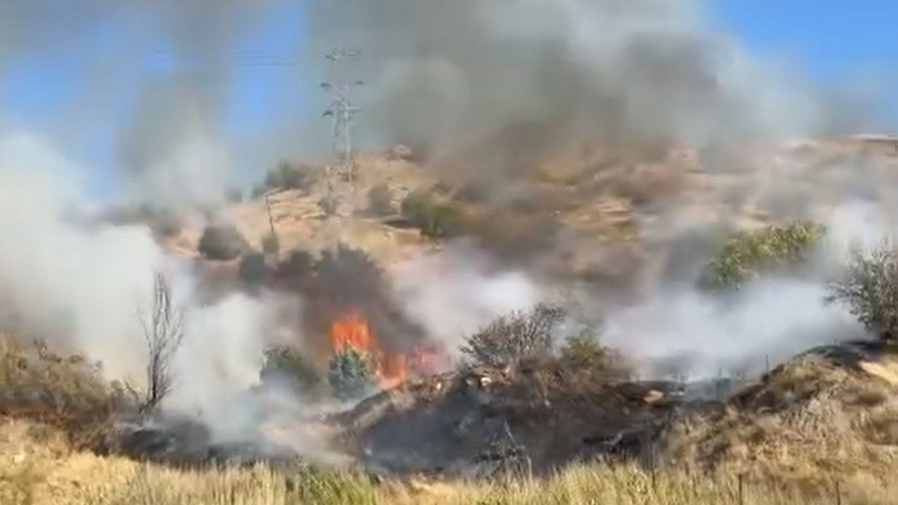 Hakkari-Yüksekova kara yolu üzerinde çıkan anız yangını, rüzgarın etkisiyle geniş bir alana yayıldı.