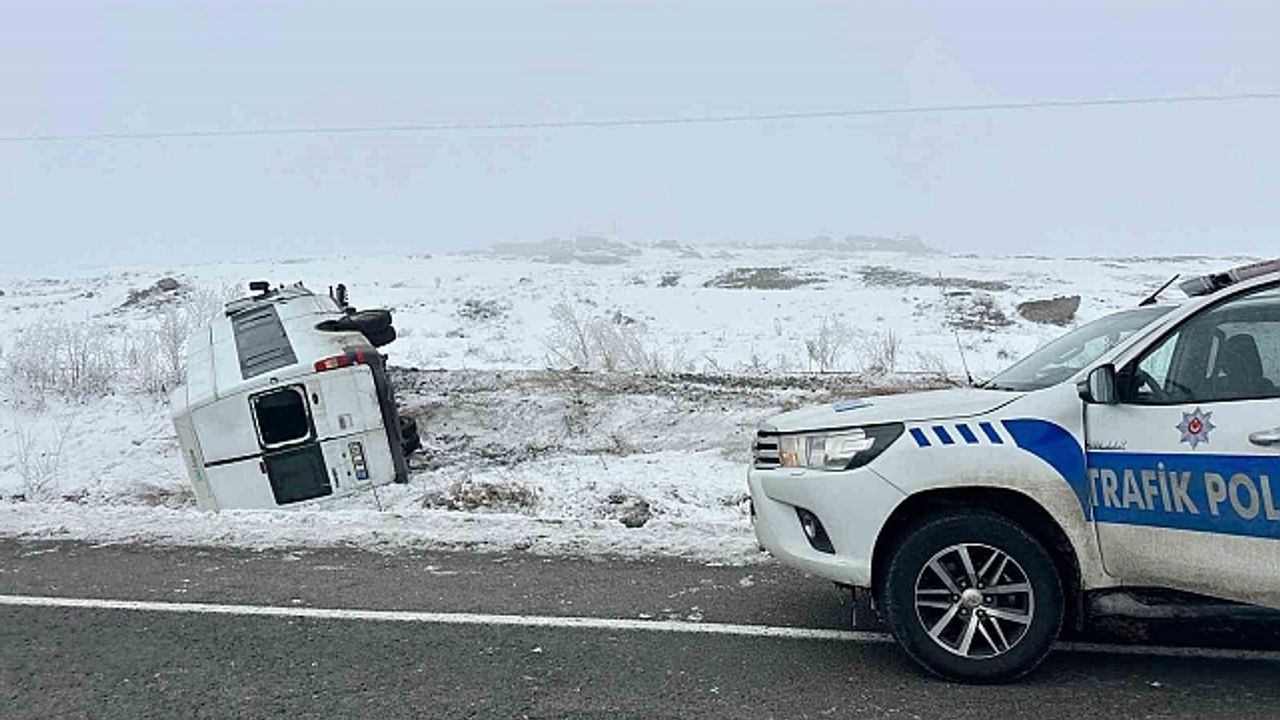 Erzurum'un Horasan ilçesinde meydana gelen trafik kazasında minibüs devrildi. Kazada yaralanan olmazken, her iki araçta da maddi hasar oluştu.