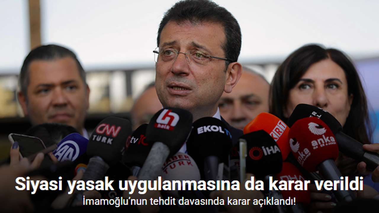 Esasa ilişkin kararını açıklayan mahkeme heyeti, sanık Ekrem İmamoğlu hakkında, ’kamu görevlisine hakaret’ suçundan 1 yıl 5 ay 15 gün, ’tehdit’ suçundan ise 2 ay 15 gün hapis cezasıyla cezalandırılmasına karar verdi. Heyet, İmamoğl’nun üzerine atılı ’terörle mücadelede görev almış kişileri hedef gösterme’ suçundan ise beraatına hükmetti. Ayrıca mahkeme, İmamoğlu hakkında siyasi yasak uygulanmasına da karar verdi