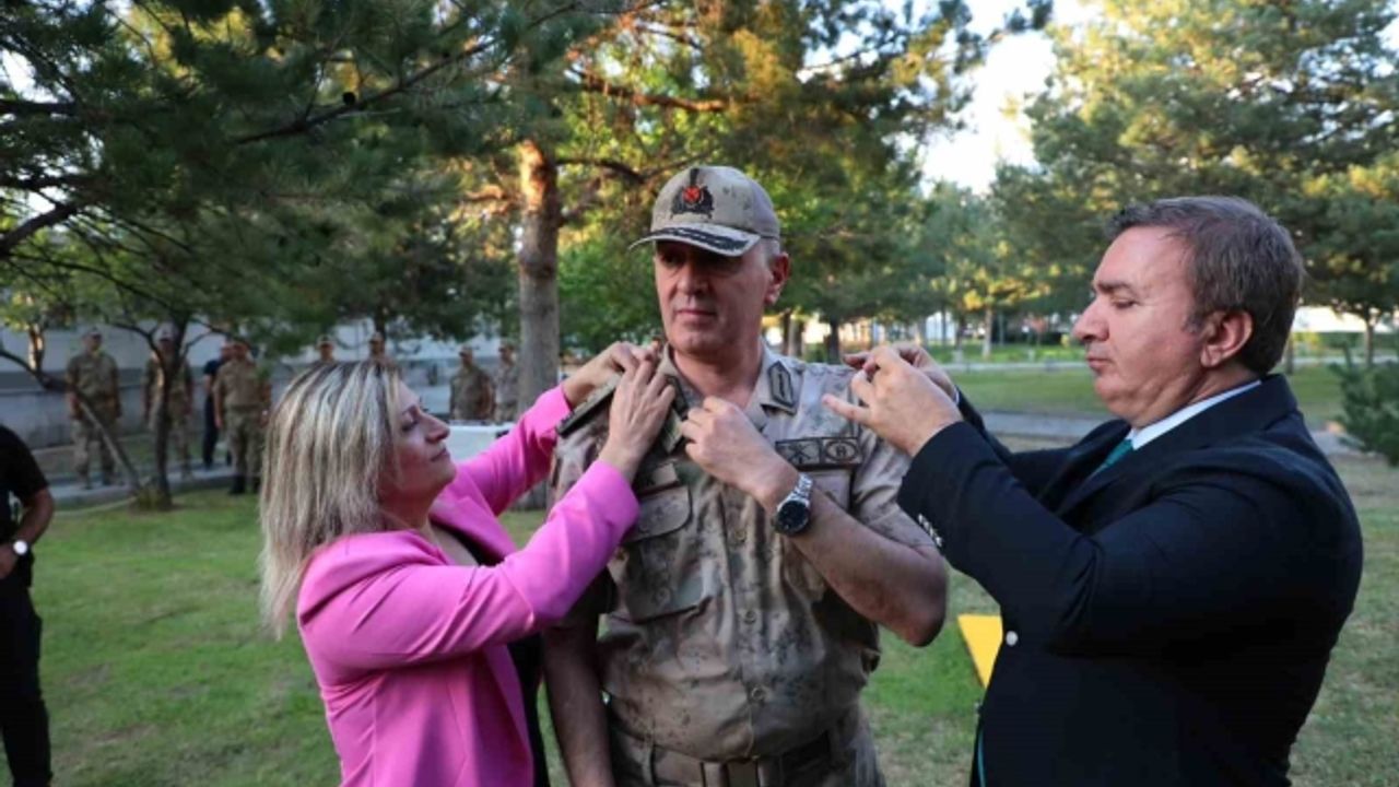 Vali Aydoğdu, halkın huzuru ve güvenliği için gece gündüz demeden fedakarca görev yapan tüm jandarma personeline teşekkür ederek, Tuğgeneralliğe terfi eden İl Jandarma Komutanı Veysel Yanık'ın rütbesini, Veysel Yanık'ın eşi ile birlikte taktı.