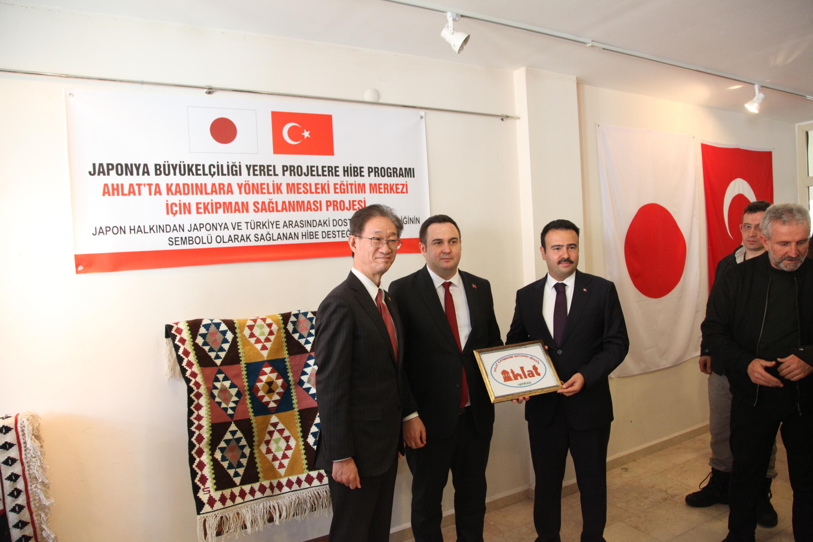 Japonya Büyükelçisi Masami Tamura ise konuşmasında şu ifadelere yer verdi: “Geçtiğimiz Ekim ayında Türkiye'de görevime başlamamdan bu yana ilk kez Doğu Anadolu Bölgesi'ni ziyaret ediyorum. Van Gölü'nün görkemli manzarasından son derece etkilendim. Aynı şekilde köklü bir geçmişe sahip olan Ahlat'ı ziyaret etmekten de büyük memnuniyet duydum. Bu vesileyle, kadınlara yönelik mesleki eğitimlerde kullanılmak üzere dikiş makinesi ve ekipmanı hibe edebilmiş olmaktan büyük mutluluk duyuyorum. Sağlanan bu ekipman sayesinde kadınların kendi emekleriyle gelir elde edebilmelerini ve toplum içinde daha aktif rol almalarını temenni ediyorum. Kadınların toplumsal hayatta daha etkin rol almalarının, bölgenin genel kalkınmasına katkı sağlayacağına yürekten inanıyorum. Japonya ile Türkiye, 1890 yılında meydana gelen Ertuğrul Fırkateyni Faciasından bu yana uzun yıllardır dostluk bağlarını güçlendirmektedir. Bu desteğin iki ülke arasındaki dostluğu daha da pekiştirmesini diliyorum. Japonya, bundan sonra da Türk halkıyla iş birliği içinde, yerel düzeyde sürdürülebilir kalkınma ve birlikte yaşamın güçlendirilmesi için destek vermeye devam edecektir. Sözlerime son verirken, başlayacak mesleki eğitim programının başarıyla tamamlanmasını diliyor, tüm katılımcılara başarı ve esenlikler temenni ediyorum.”