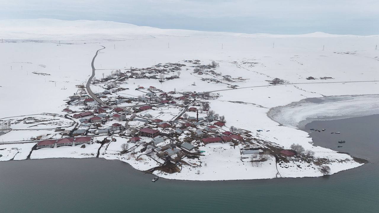 Ahlat ilçe merkezine yaklaşık 25 kilometre uzaklıkta bulunan Dilburnu Köyü, eşsiz güzelliğiyle dikkat çekiyor. Nazik Gölü’nün en güzel kıyılarından birine sahip olduğu bilinen köy, yağan karın ardından bembeyaz örtüyle kaplanarak adeta görsel şölen oluşturdu. Nazik Gölü kenarında yer alan köyün doğal güzellikleri, havadan dron ile görüntülendi. Çekilen görüntülerde, karla kaplı köy evleri, göl kıyısındaki doğal yapı ve beyaz örtüyle bütünleşen manzara izleyenleri hayran bıraktı. Özellikle göl kıyısında sıralanan balıkçı tekneleri, kar altındaki manzaraya ayrı bir güzellik kattı. Kışın sakinliği ile gölün huzur veren görüntüsünün birleştiği Dilburnu Köyü, doğa ve fotoğraf tutkunları için adeta eşsiz bir tablo sundu.