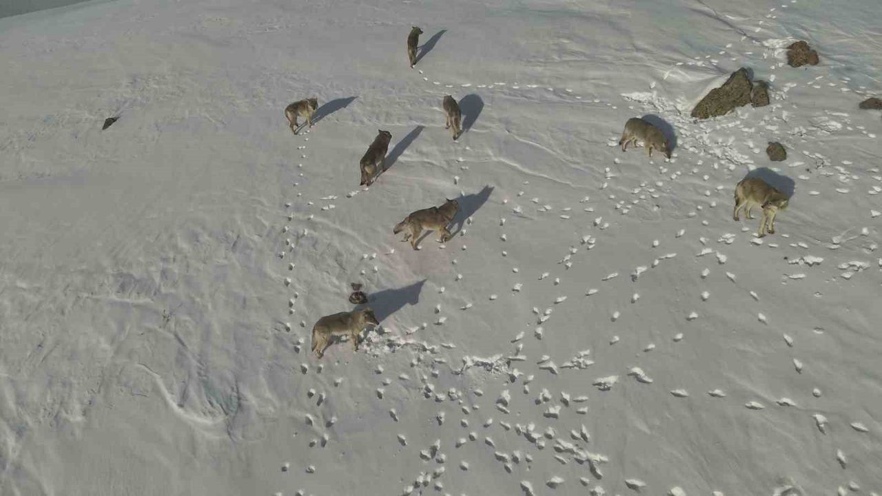 Erzurum'un Karayazı ilçesinde gün içerisinde merkez yakınlarında kurt sürüsü görüntülendi. Vatandaşların dikkatini çeken sürünün en önünde, sürüyü koruyan ve yönlendiren alfa kurdun yer aldığı görüldü.