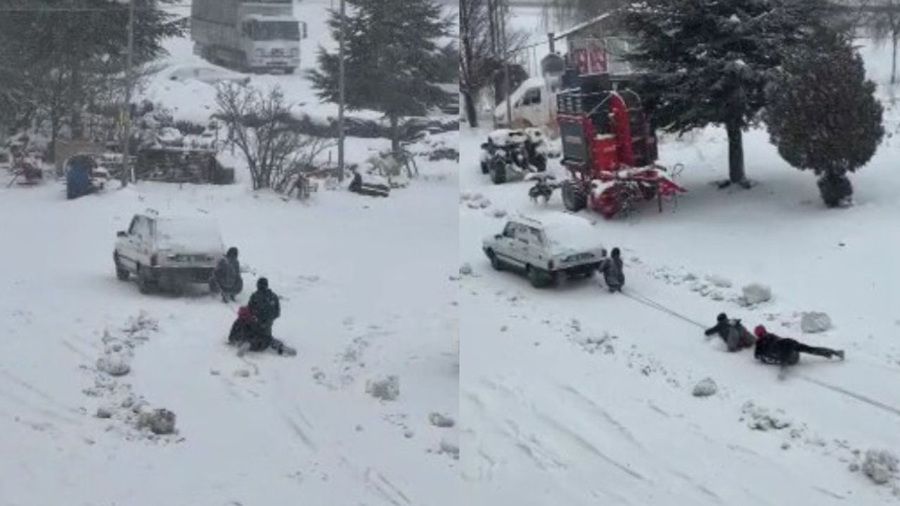 Kar yağışı sonrası boş alanı değerlendiren gençler, Toros marka bir araca bağladıkları ipe tutunarak kaydı. Ortaya çıkan görüntüler hem sanayi esnafını hem de çevrede bulunanları gülümsetti. Kısa süreli eğlencenin ardından gençler tekrar işlerinin başına döndü.