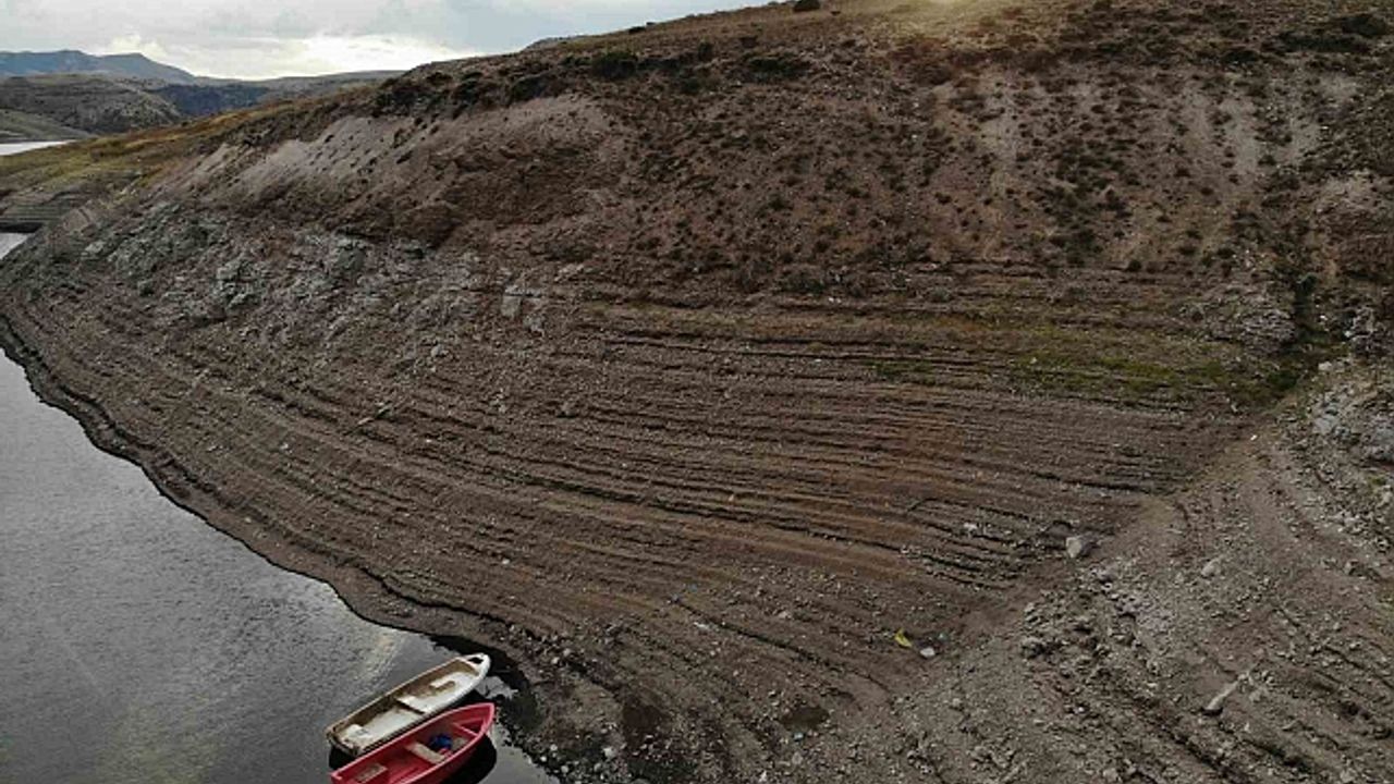 Sarıkamış'ta Aras Nehri üzerinde kurulan Karakurt Barajı Gölü'nde drone ile çekilen görüntülerde suyun çıktığı seviye ve çekilmesinden sonra geldiği nokta dikkat çekti.
