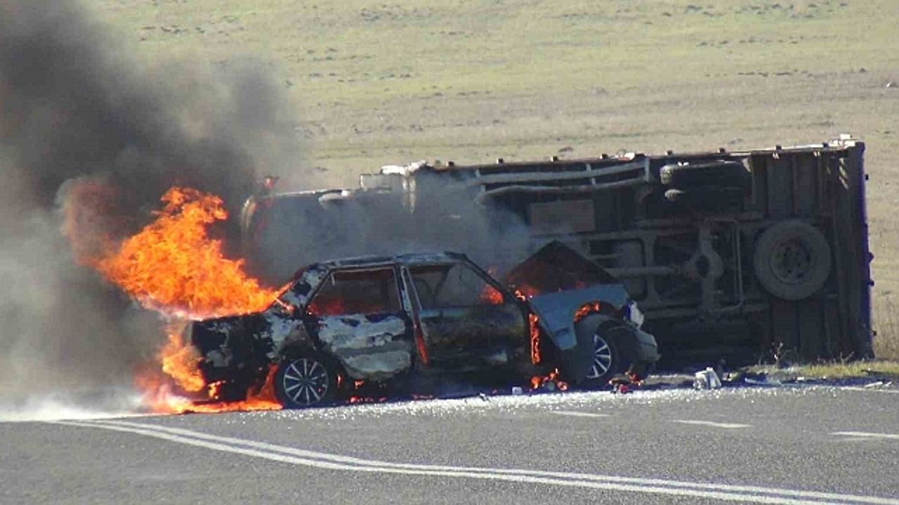 Kars'ta kamyonetle otomobilin çarpıştığı kazada, otomobil alev topuna dönüp yanarken, kamyonet ise yan yattı.