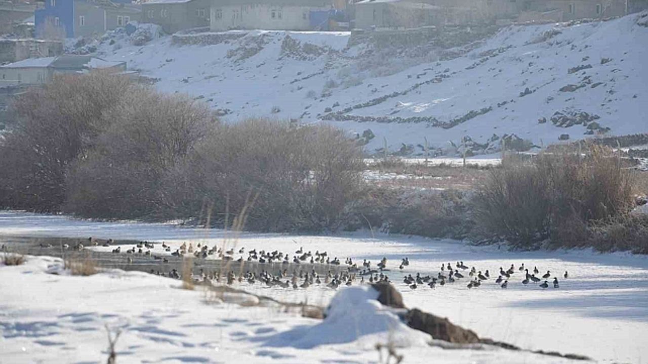 Soğuk havanın etkisiyle büyük bir kısmı buz tutan Kars Çayı'nın açık kısmında toplanan yüzlerce yaban ördeği, hem doğaseverlerin hem de fotoğrafçıların ilgisini çekti.