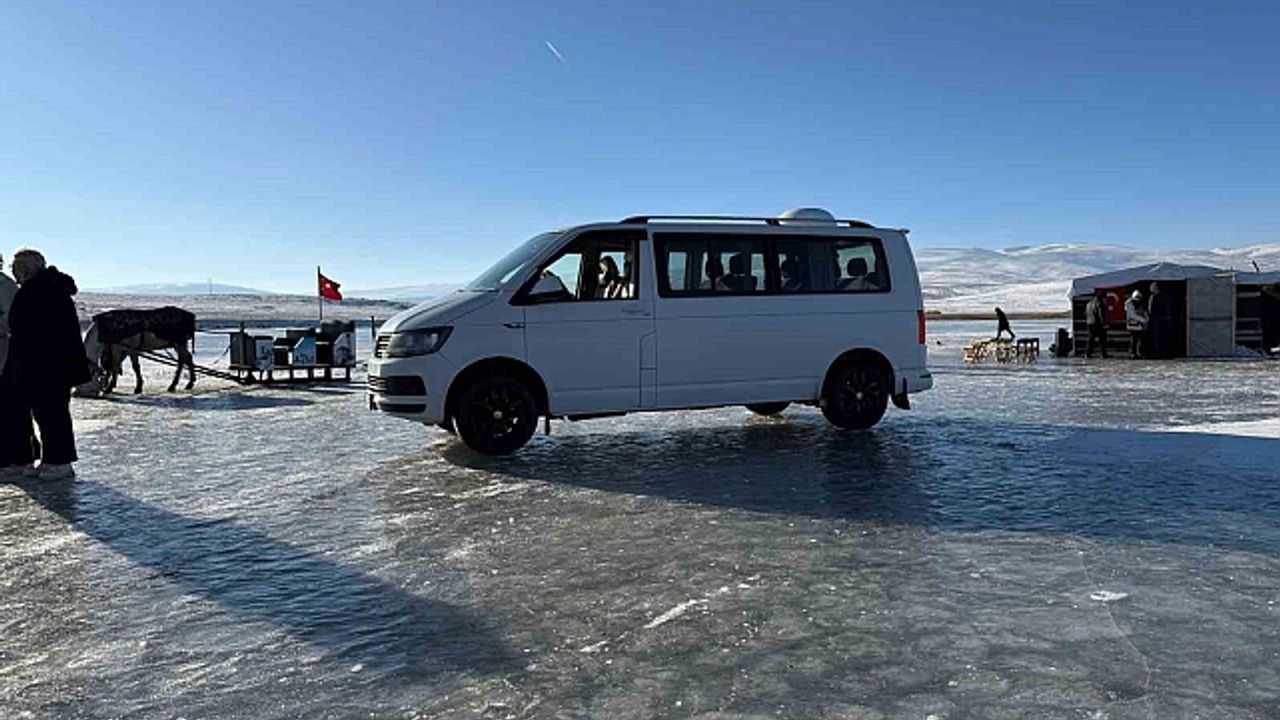 Yaklaşık 40 santim buz kalınlığı bulunan Çıldır Gölü üzerine yaklaşık 2 tonluk ticari aracıyla çıkan sürücü görenleri hayrete düşürdü.