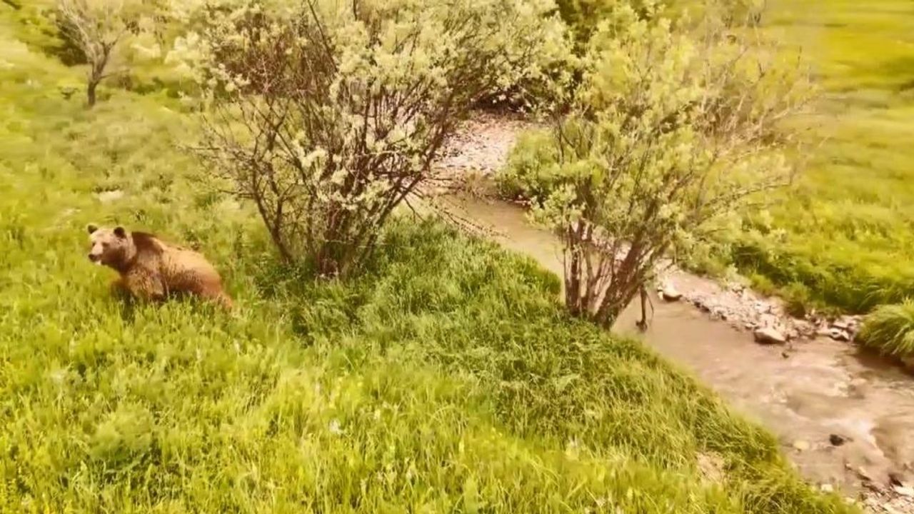 Kars’ta boz ayı be kez dron ile kaydedildi. Salına salına gezen ayı anbean kaydedildi.