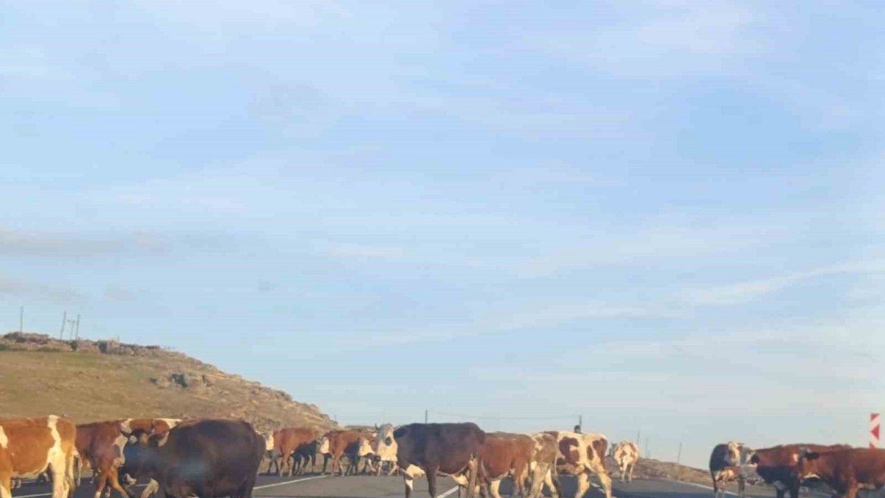Kars’ta büyükbaş hayvanlar karayoluna çıkarak sürücülere zor anlar yaşattı.